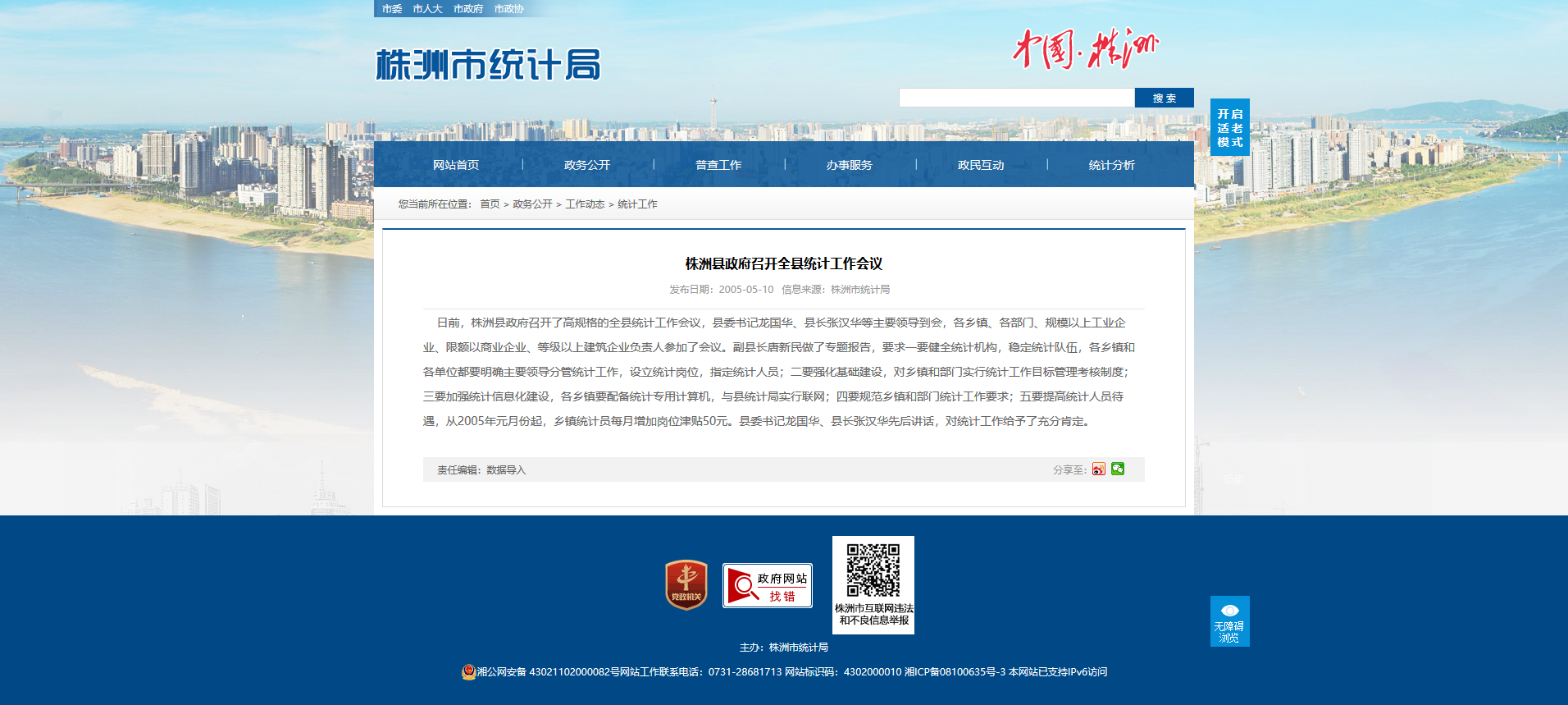 日前,株洲县政府召开了高规格的全县统计工作会议,县委书记龙国华、县长张汉华等主要领导到会,各乡镇、各部门、规模以上工业企业、限额以商业企业、等级以上建筑企业负责人参加了会议。副县长唐新民做了专题报告,要求一要健全统计机构,稳定统计队伍,各乡镇和各单位都要明确主要领导分管统计工作,设立统计岗位,指定统计人员;二要强化基础建设,对乡镇和部门实行统计工作目标管理考核制度;三要加强统计信息化建设,各乡镇要配备统计专用计算机,与县统计局实行联网;四要规范乡镇和部门统计工作要求;五要提高统计人员待遇,从2005年元月份起,乡镇统计员每月增加岗位津贴50元。县委书记龙国华、县长张汉华先后讲话,对统计工作给予了充分肯定。