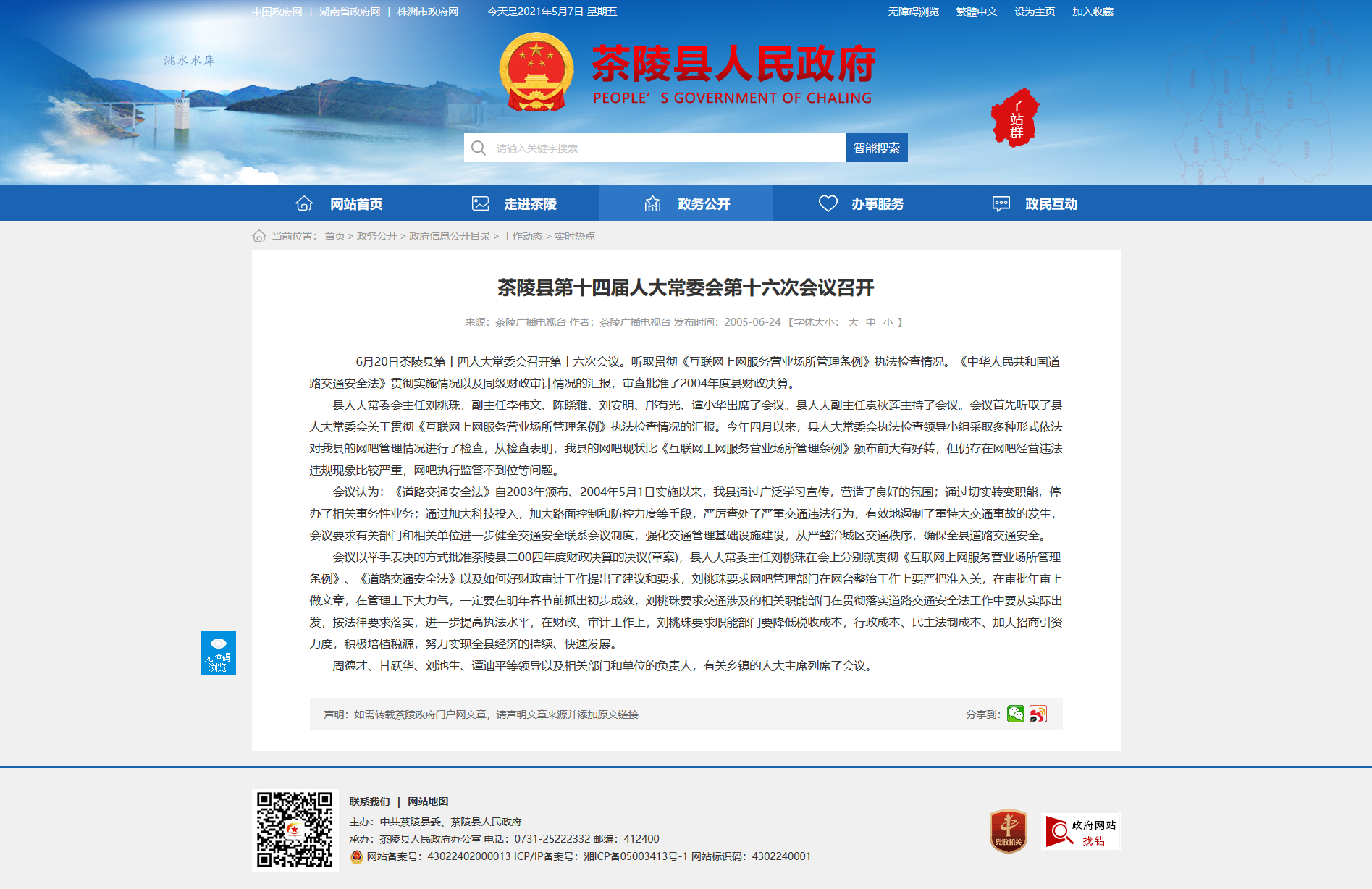 6月20日茶陵县第十四人大常委会召开第十六次会议。听取贯彻《互联网上网服务营业场所管理条例》执法检查情况。《中华人民共和国道路交通安全法》贯彻实施情况以及同级财政审计情况的汇报,审查批准了2004年度县财政决算。