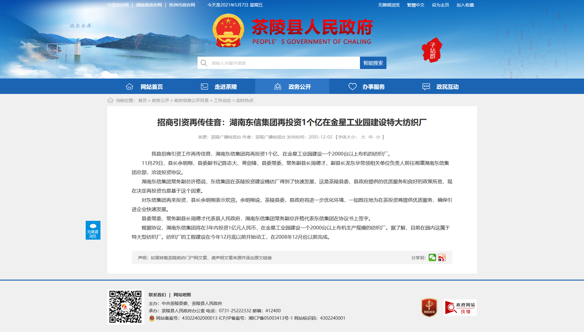 湖南东信集团常务副总许格说,东信集团在茶陵投资建设棉纺厂得到了快速发展,这是茶陵县委、县政府提供的优质服务和良好的政策所致,现在决定再投资也是基于这个因素。