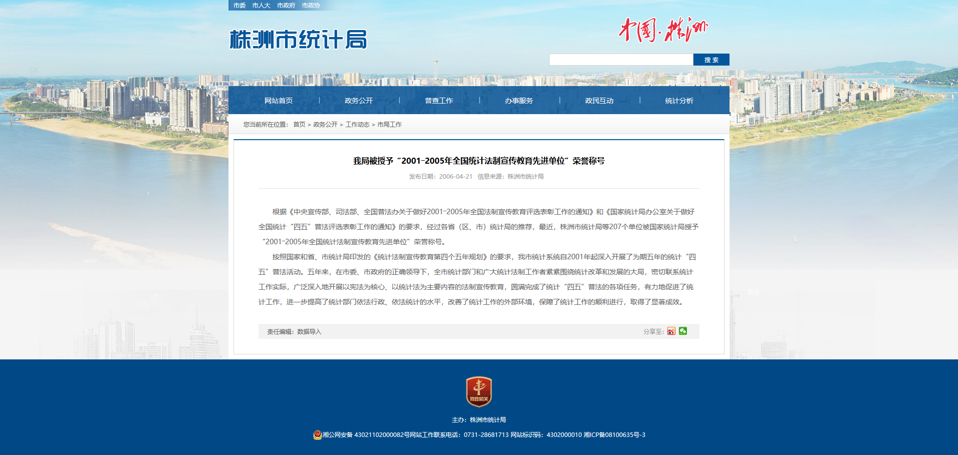 根据《中央宣传部、司法部、全国普法办关于做好2001―2005年全国法制宣传教育评选表彰工作的通知》和《国家统计局办公室关于做好全国统计“四五”普法评选表彰工作的通知》的要求,经过各省(区、市)统计局的推荐,最近,株洲市统计局等207个单位被国家统计局授予“2001―2005年全国统计法制宣传教育先进单位”荣誉称号。