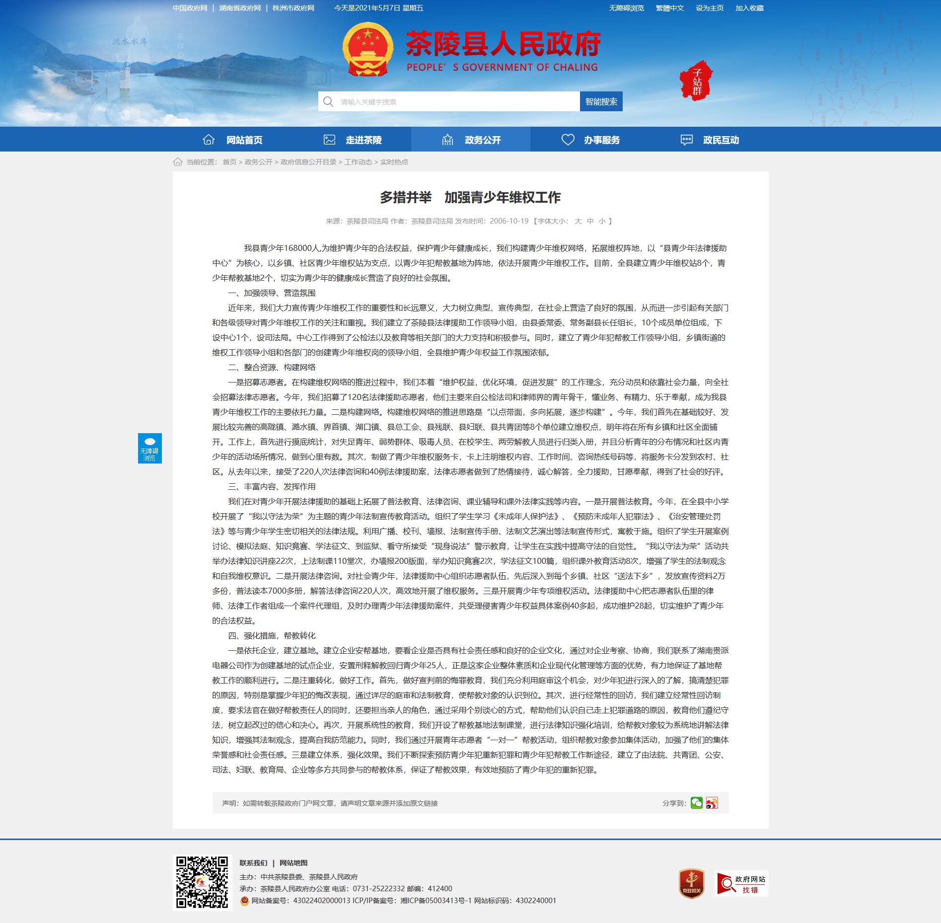 近年来,我们大力宣传青少年维权工作的重要性和长远意义,大力树立典型、宣传典型,在社会上营造了良好的氛围,从而进一步引起有关部门和各级领导对青少年维权工作的关注和重视。我们建立了茶陵县法律援助工作领导小组,由县委常委、常务副县长任组长,10个成员单位组成,下设中心1个,设司法局。中心工作得到了公检法以及教育等相关部门的大力支持和积极参与。同时,建立了青少年犯帮教工作领导小组,乡镇街道的维权工作领导小组和各部门的创建青少年维权岗的领导小组,全县维护青少年权益工作氛围浓郁。