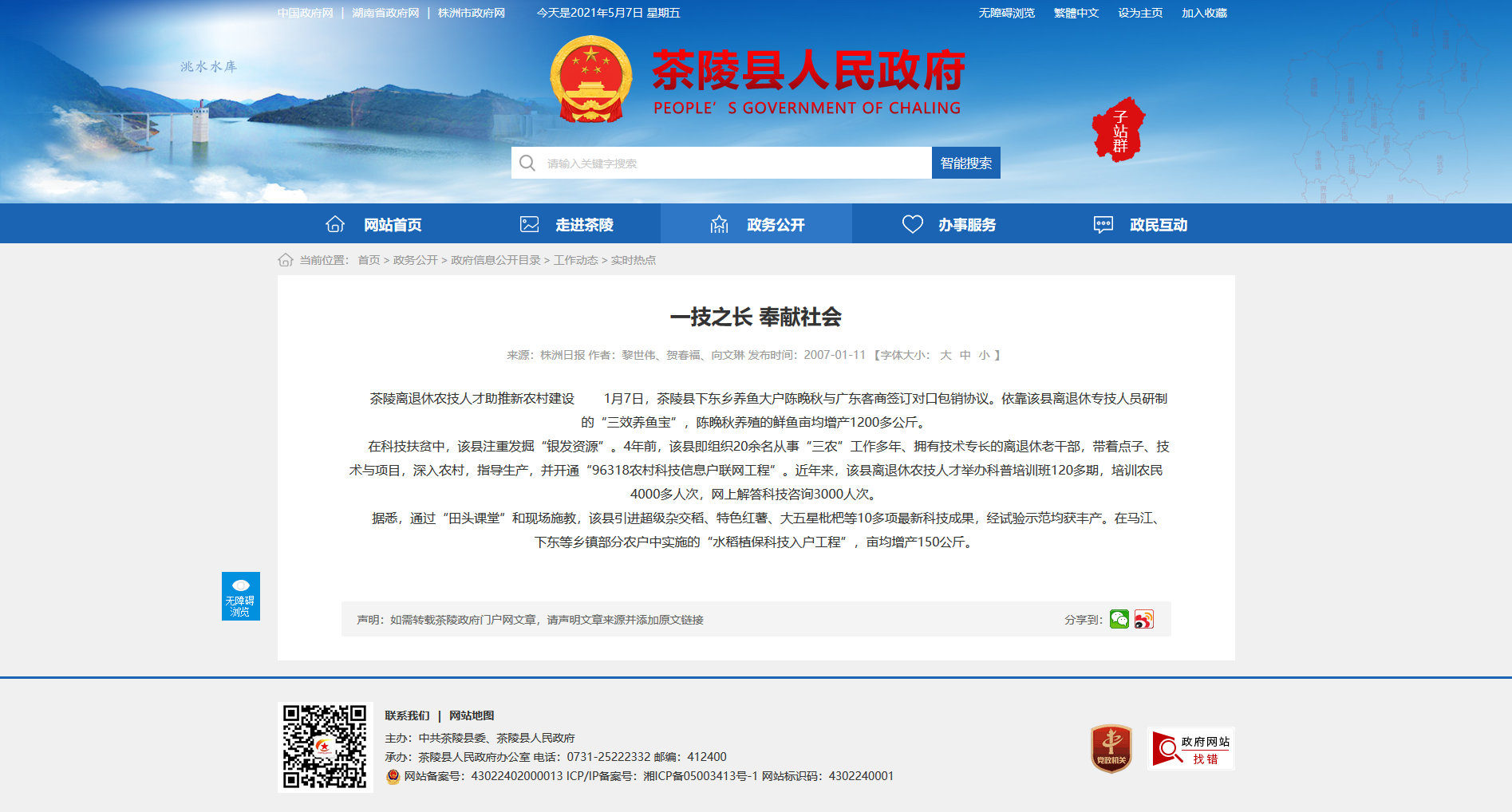 茶陵离退休农技人才助推新农村建设 1月7日,茶陵县下东乡养鱼大户陈晚秋与广东客商签订对口包销协议。依靠该县离退休专技人员研制的“三效养鱼宝”,陈晚秋养殖的鲜鱼亩均增产1200多公斤。
