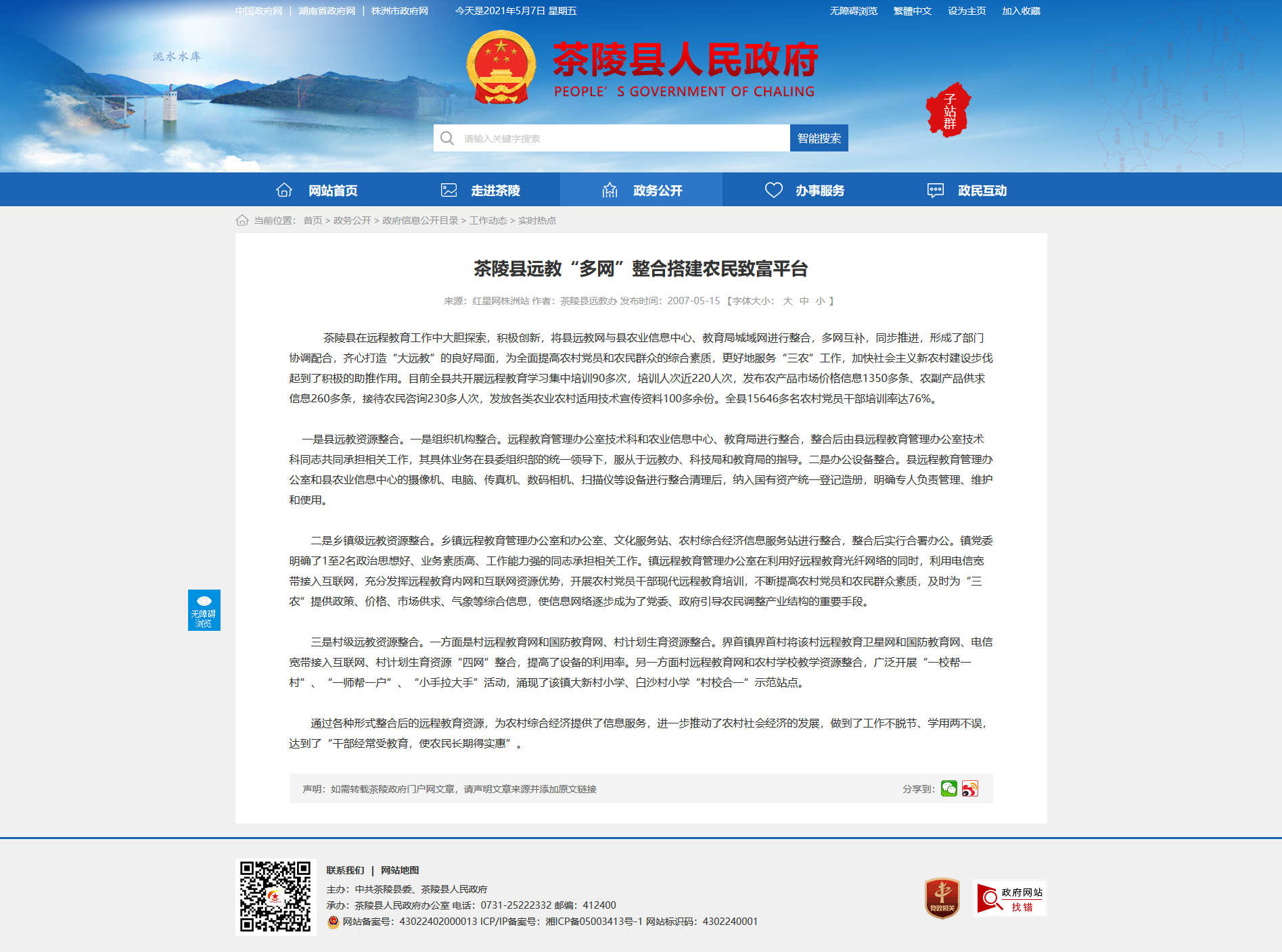 茶陵县在远程教育工作中大胆探索,积极创新,将县远教网与县农业信息中心、教育局城域网进行整合,多网互补,同步推进,形成了部门协调配合,齐心打造“大远教”的良好局面,为全面提高农村党员和农民群众的综合素质,更好地服务“三农”工作,加快社会主义新农村建设步伐起到了积极的助推作用。目前全县共开展远程教育学习集中培训90多次,培训人次近220人次,发布农产品市场价格信息1350多条、农副产品供求信息260多条,接待农民咨询230多人次,发放各类农业农村适用技术宣传资料100多余份。全县15646多名农村党员干部培训率达76%。
