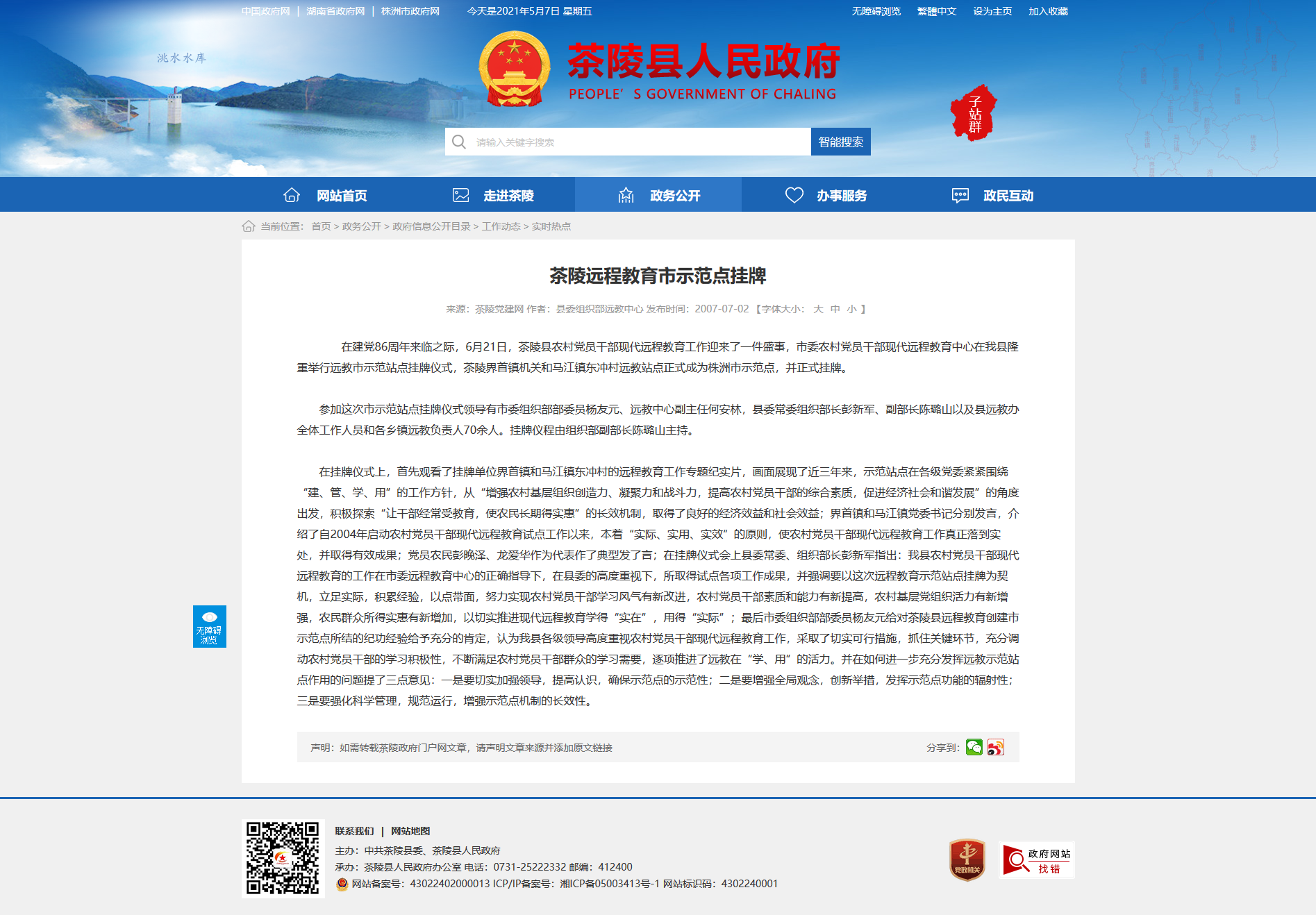 在建党86周年来临之际,6月21日,茶陵县农村党员干部现代远程教育工作迎来了一件盛事,市委农村党员干部现代远程教育中心在我县隆重举行远教市示范站点挂牌仪式,茶陵界首镇机关和马江镇东冲村远教站点正式成为株洲市示范点,并正式挂牌。