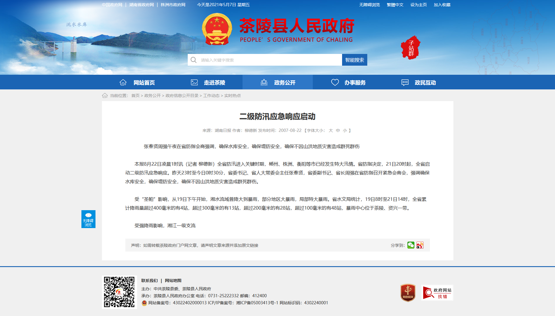 本报8月22日凌晨1时讯(记者 柳德新)全省防汛进入关键时期,郴州、株洲、衡阳等市已经发生特大汛情。省防指决定,21日20时起,全省启动二级防汛应急响应。昨天23时至今日0时30分,省委书记、省人大常委会主任张春贤,省委副书记、省长周强在省防指召开紧急会商会,强调确保水库安全,确保堤防安全,确保不因山洪地质灾害造成群死群伤。