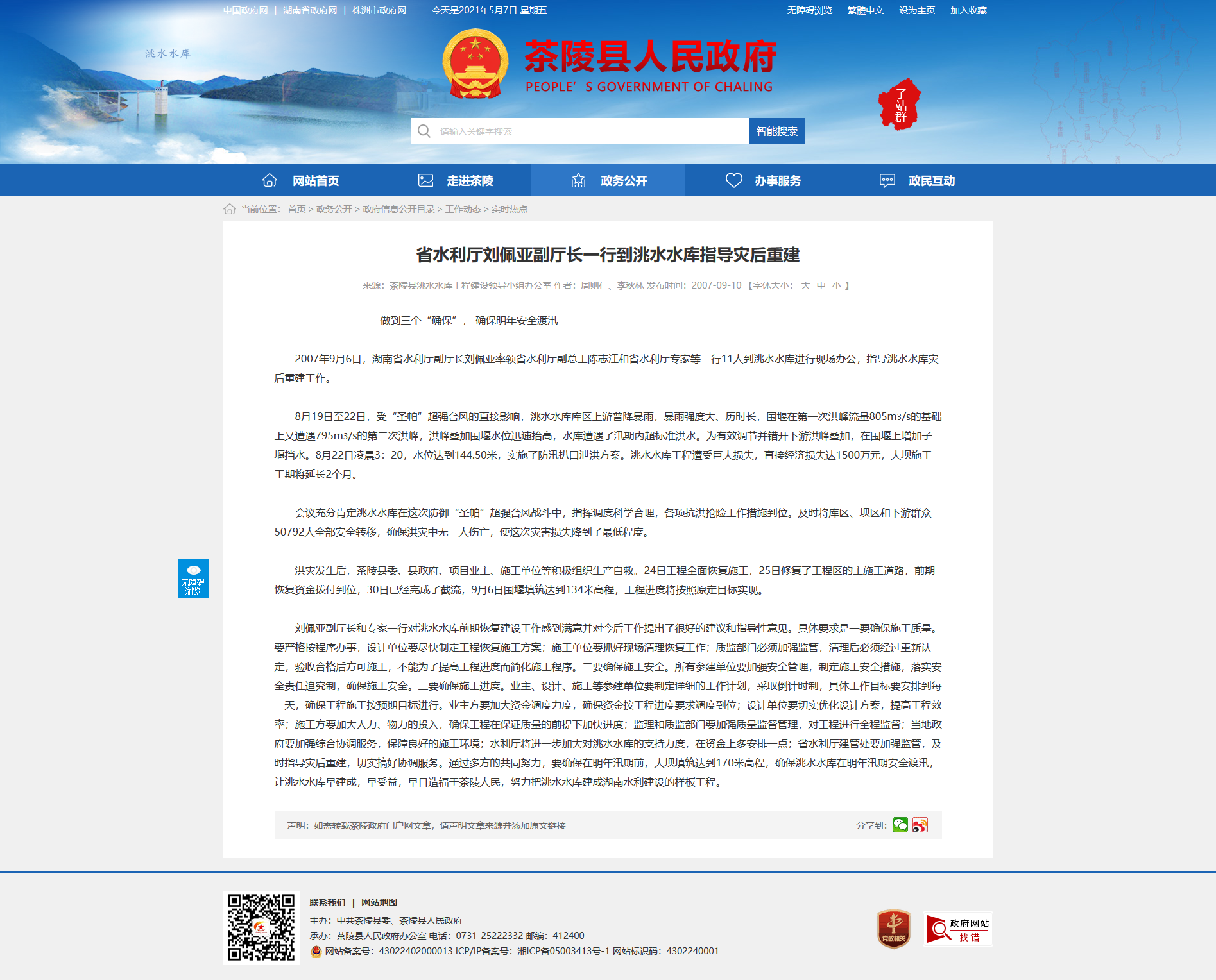 2007年9月6日,湖南省水利厅副厅长刘佩亚率领省水利厅副总工陈志江和省水利厅专家等一行11人到洮水水库进行现场办公,指导洮水水库灾后重建工作。