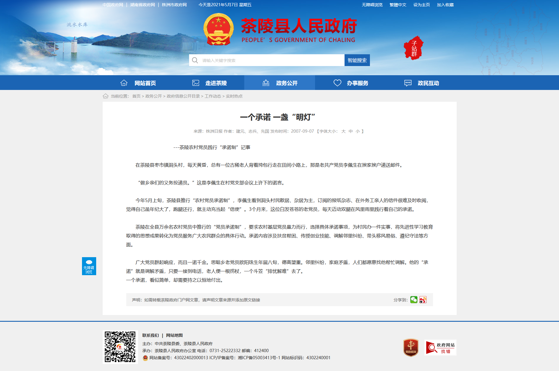 茶陵在全县万余名农村党员中推行的“党员承诺制”,要求农村基层党员量力而行,选择具体承诺事项,为村民办一件实事,将先进性学习教育取得的思想成果转化为党员服务广大农民群众的具体行动。承诺内容涉及扶贫帮困、传授创业技能、调解邻里纠纷、带头移风易俗、遵纪守法等方面。