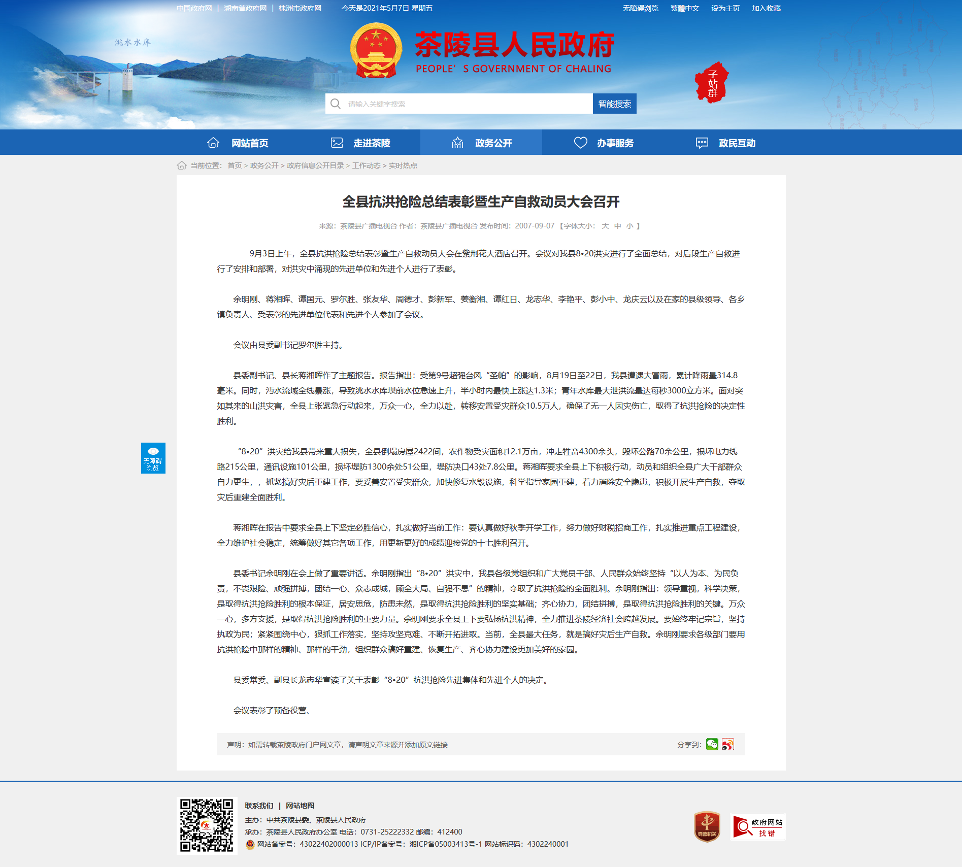 县委书记余明刚在会上做了重要讲话。余明刚指出“8•20”洪灾中,我县各级党组织和广大党员干部、人民群众始终坚持“以人为本、为民负责,不畏艰险、顽强拼搏,团结一心、众志成城,顾全大局、自强不息”的精神,夺取了抗洪抢险的全面胜利。余明刚指出:领导重视,科学决策,是取得抗洪抢险胜利的根本保证,居安思危,防患未然,是取得抗洪抢险胜利的坚实基础;齐心协力,团结拼搏,是取得抗洪抢险胜利的关键。万众一心,多方支援,是取得抗洪抢险胜利的重要力量。余明刚要求全县上下要弘扬抗洪精神,全力推进茶陵经济社会跨越发展。要始终牢记宗旨,坚持执政为民;紧紧围绕中心,狠抓工作落实,坚持攻坚克难、不断开拓进取。当前,全县最大任务,就是搞好灾后生产自救。余明刚要求各级部门要用抗洪抢险中那样的精神、那样的干劲,组织群众搞好重建、恢复生产、齐心协力建设更加美好的家园。