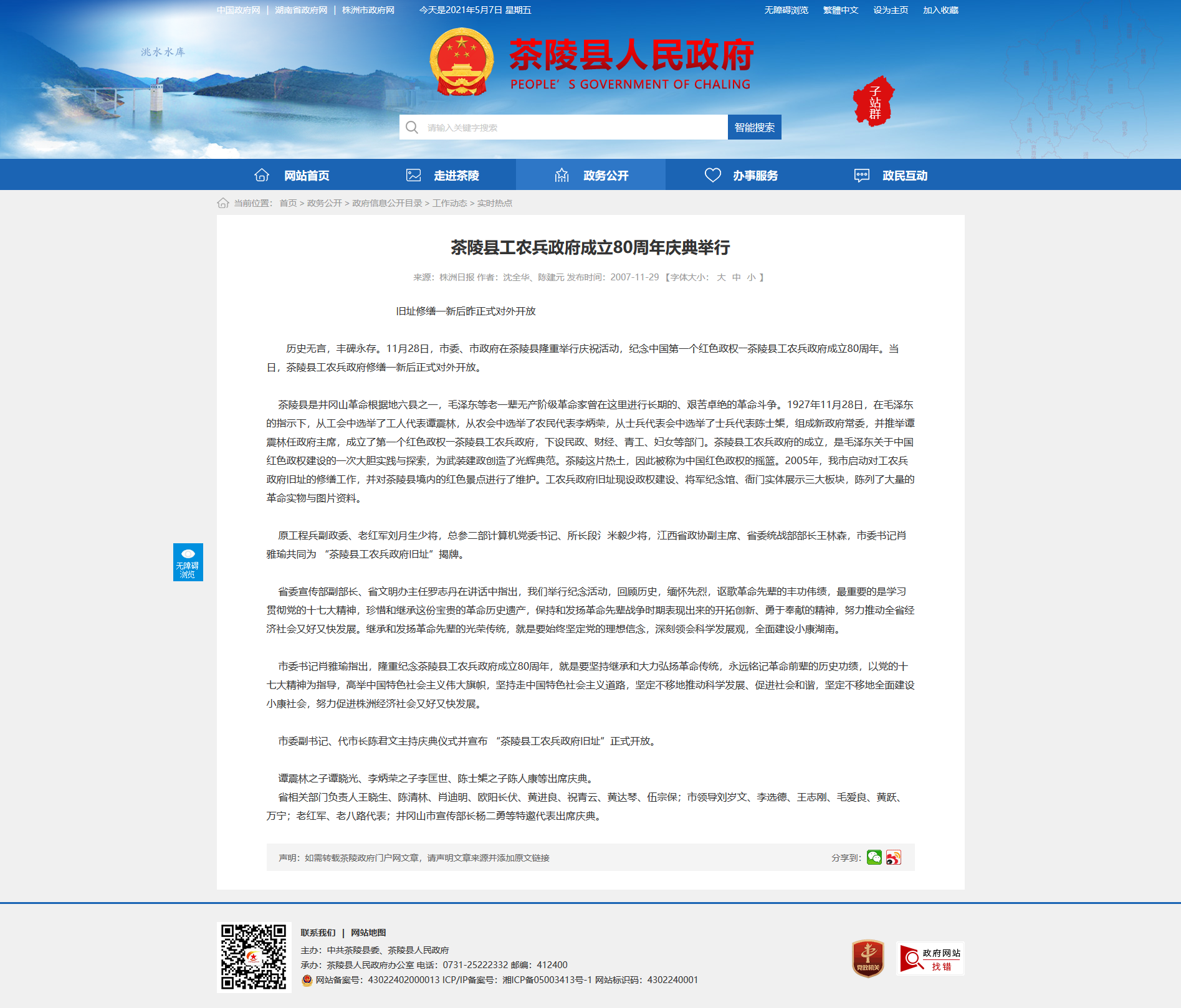 茶陵县是井冈山革命根据地六县之一,毛泽东等老一辈无产阶级革命家曾在这里进行长期的、艰苦卓绝的革命斗争。1927年11月28日,在毛泽东的指示下,从工会中选举了工人代表谭震林,从农会中选举了农民代表李炳荣,从士兵代表会中选举了士兵代表陈士榘,组成新政府常委,并推举谭震林任政府主席,成立了第一个红色政权――茶陵县工农兵政府,下设民政、财经、青工、妇女等部门。茶陵县工农兵政府的成立,是毛泽东关于中国红色政权建设的一次大胆实践与探索,为武装建政创造了光辉典范。茶陵这片热土,因此被称为中国红色政权的摇篮。2005年,我市启动对工农兵政府旧址的修缮工作,并对茶陵县境内的红色景点进行了维护。工农兵政府旧址现设政权建设、将军纪念馆、衙门实体展示三大板块,陈列了大量的革命实物与图片资料。