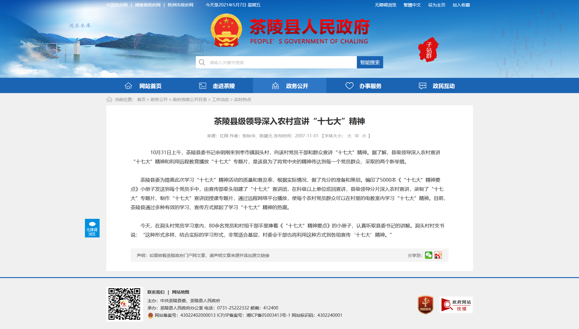 10月31日上午,茶陵县委书记余明刚来到枣市镇洞头村,向该村党员干部和群众宣讲“十七大”精神。据了解,县级领导深入农村宣讲“十七大”精神和利用远程教育播放“十七大”专题片,是该县为了将党中央的精神传达到每一个党员群众,采取的两个新举措。