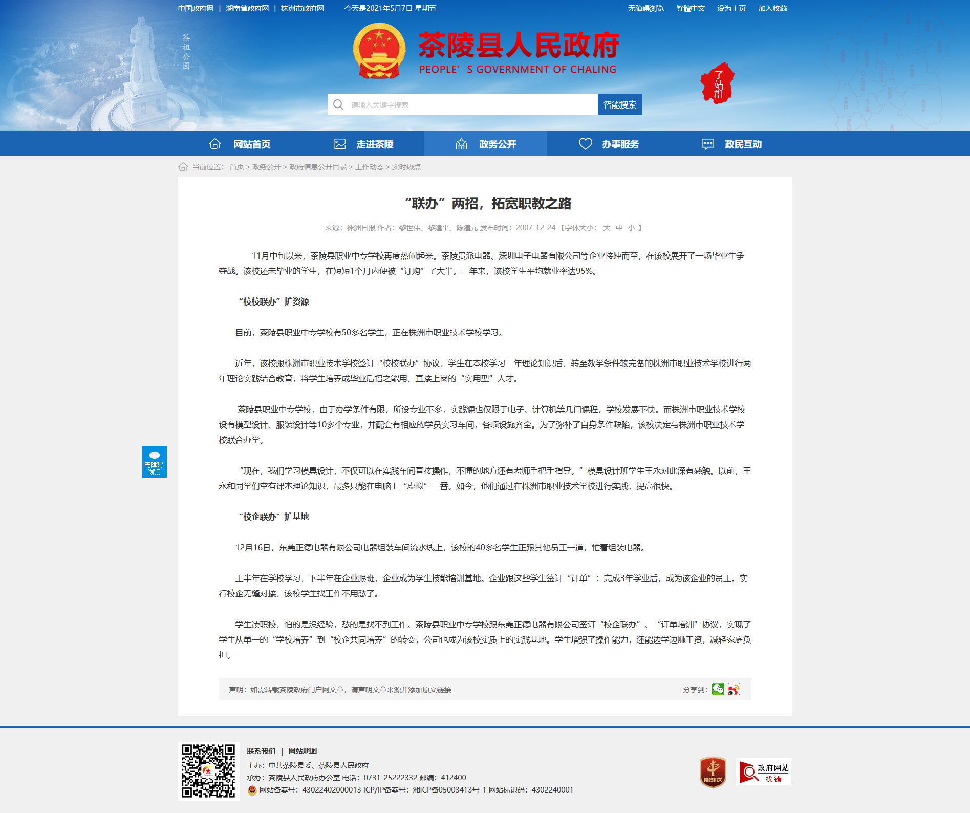 茶陵县职业中专学校,由于办学条件有限,所设专业不多,实践课也仅限于电子、计算机等几门课程,学校发展不快。而株洲市职业技术学校设有模型设计、服装设计等10多个专业,并配套有相应的学员实习车间,各项设施齐全。为了弥补了自身条件缺陷,该校决定与株洲市职业技术学校联合办学。