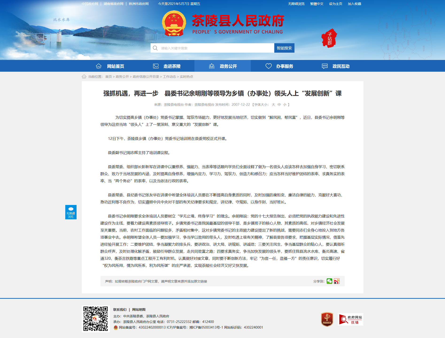 县委书记余明刚要求全体培训人员要树立“学无止境,终身学习”的理念。余明刚说:党的十七大报告指出,必须把党的执政能力建设和先进性建设作为主线,要着力建设高素质领导班子。乡镇党委书记是我国最基层的领导干部,是乡镇班子的核心人物,其素质的高低,对乡镇经济社会发展至关重要。当前,农村工作面临的问题较多,矛盾相对集中,这对乡镇党委书记的主政能力建设提出了新的挑战,需要同志们全身心地投入到地方各项事业中去。余明刚希望全体人员一要加强学习,争当学以致用的带头人,及时吃透上级有关精神,了解县里各项要求,把握基层实际情况,借鉴先进经验开展工作;二要维护团结,争当凝聚力的排头兵,要讲政治、讲大局、讲规矩、讲诚信;三要关注民生,争当基层群众的贴心人,要认真倾听群众呼声,及时处理化解矛盾,鼓励引导群众发展,走共同致富之路;四要求真务实,争当加快发展的领头羊,要抓住我县洮水水库、衡炎高速、省道320、衡茶吉铁路等重点工程开工有利时机,认真做好对接文章,同时要不断创新方法,牢记“为官一任,造福一方”的责任意识,切实履行好“权为民所用,情为民所系,利为民所谋”的庄严承诺,实现茶陵社会经济又好又快发展。