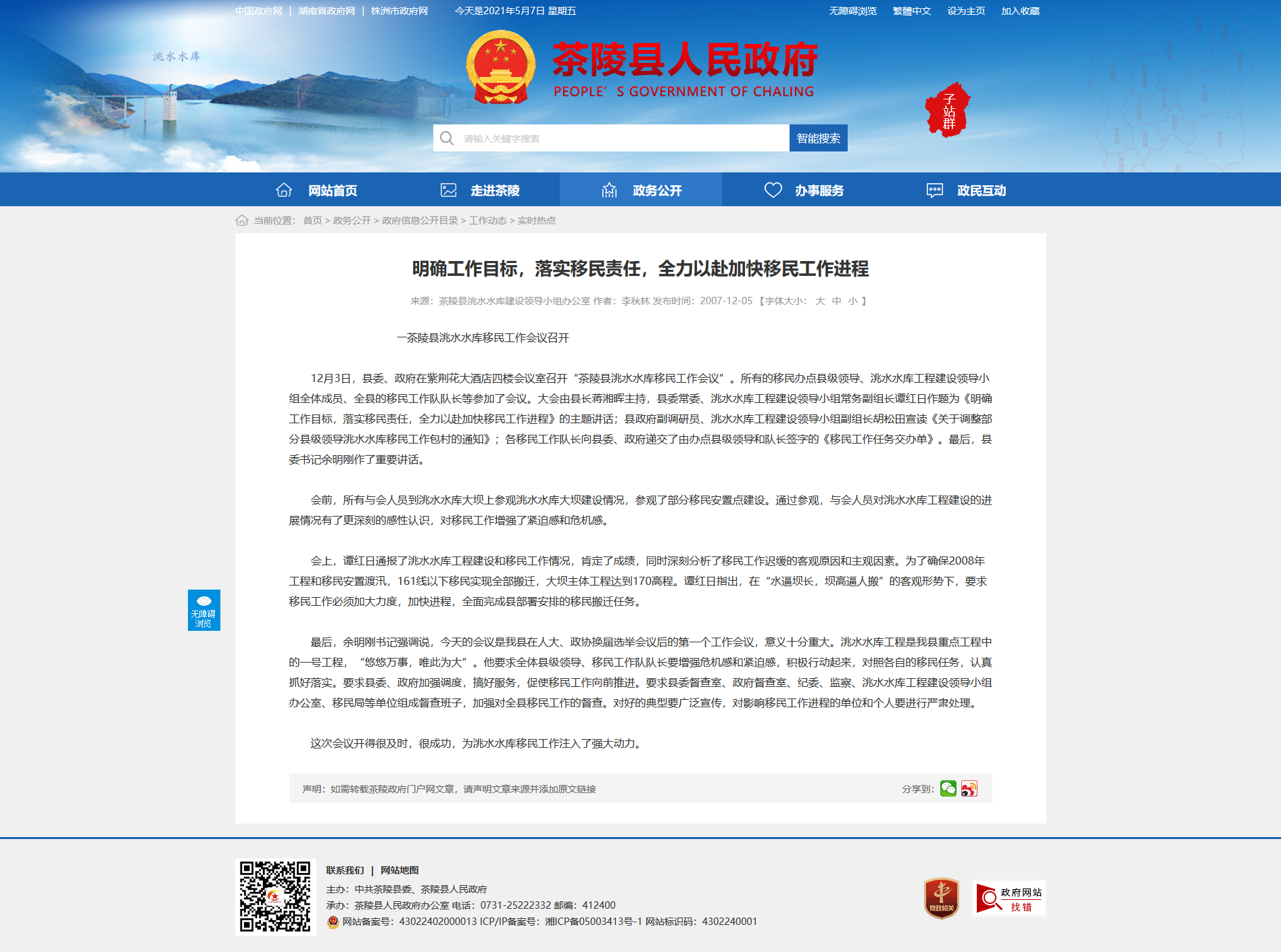 12月3日,县委、政府在紫荆花大酒店四楼会议室召开“茶陵县洮水水库移民工作会议”。所有的移民办点县级领导、洮水水库工程建设领导小组全体成员、全县的移民工作队队长等参加了会议。大会由县长蒋湘晖主持,县委常委、洮水水库工程建设领导小组常务副组长谭红日作题为《明确工作目标,落实移民责任,全力以赴加快移民工作进程》的主题讲话;县政府副调研员、洮水水库工程建设领导小组副组长胡松田宣读《关于调整部分县级领导洮水水库移民工作包村的通知》;各移民工作队长向县委、政府递交了由办点县级领导和队长签字的《移民工作任务交办单》。最后,县委书记余明刚作了重要讲话。