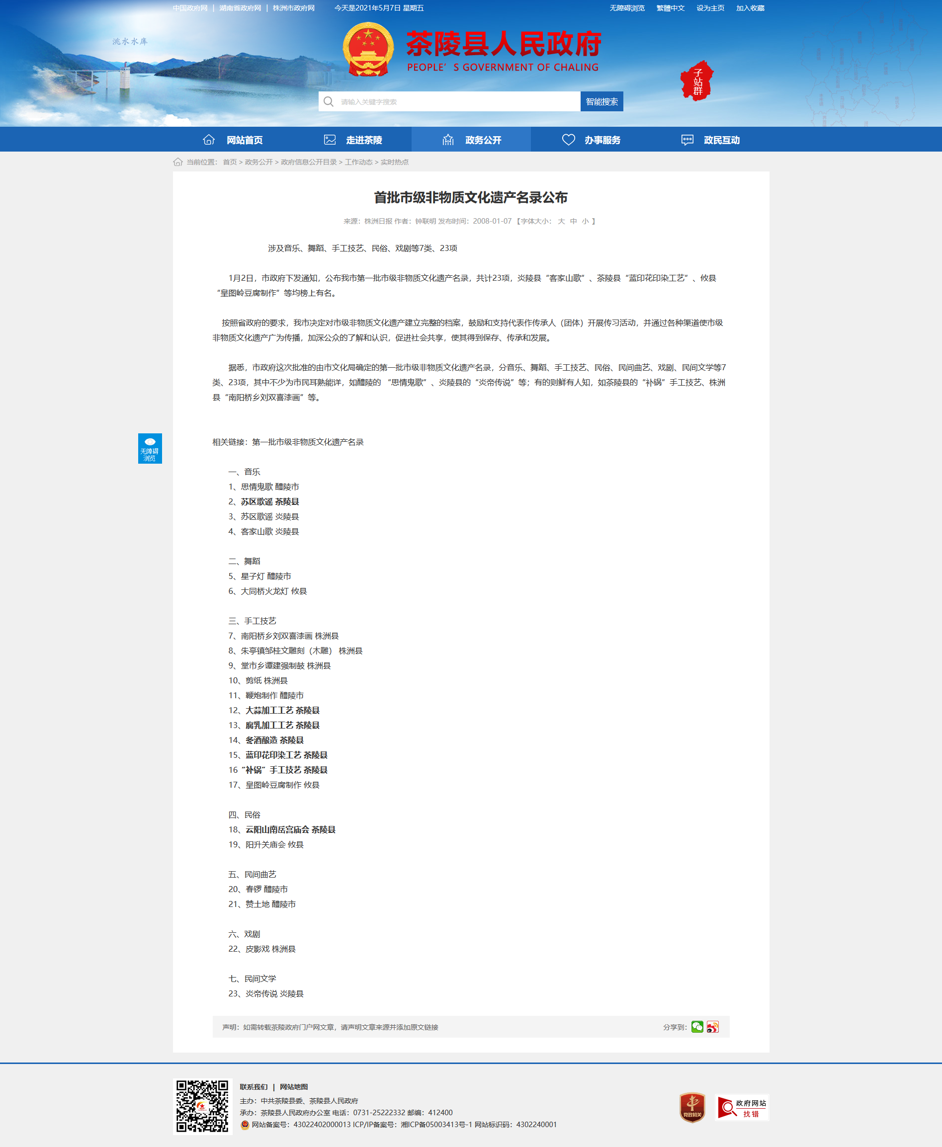 1月2日,市政府下发通知,公布我市第一批市级非物质文化遗产名录,共计23项,炎陵县“客家山歌”、茶陵县“蓝印花印染工艺”、攸县“皇图岭豆腐制作”等均榜上有名。