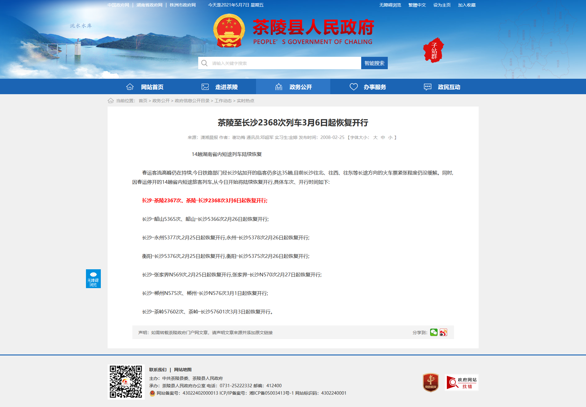 长沙―茶陵2367次、茶陵―长沙2368次3月6日起恢复开行;