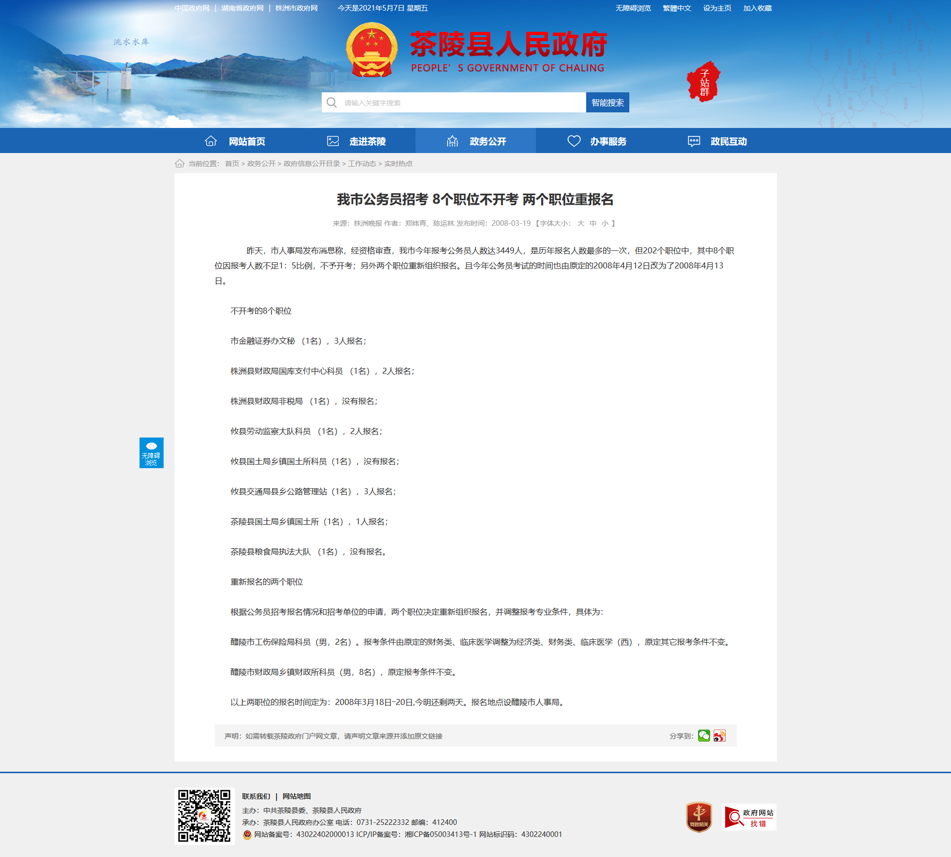 以上两职位的报名时间定为:2008年3月18日―20日,今明还剩两天。报名地点设醴陵市人事局。