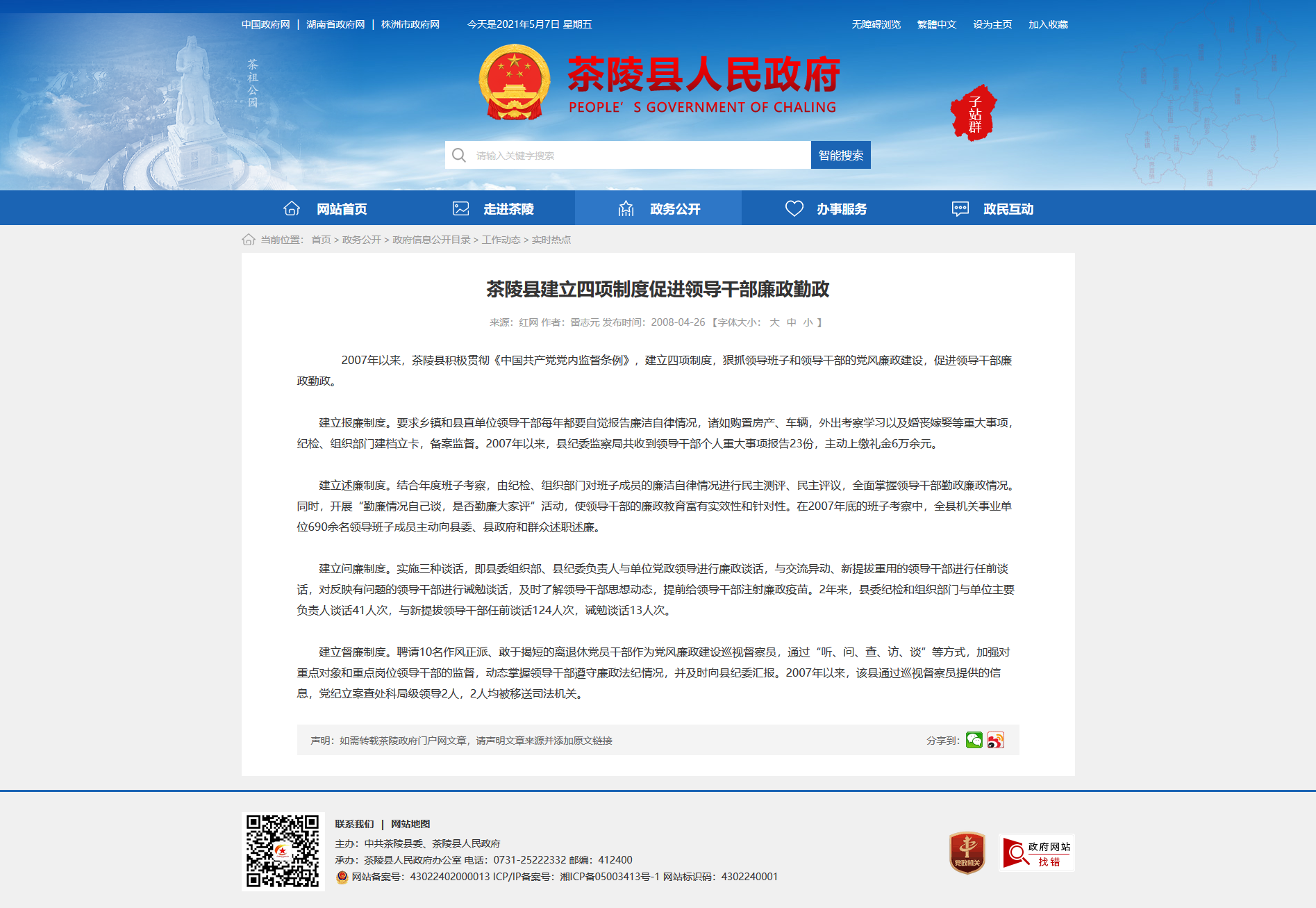 2007年以来,茶陵县积极贯彻《中国共产党党内监督条例》,建立四项制度,狠抓领导班子和领导干部的党风廉政建设,促进领导干部廉政勤政。