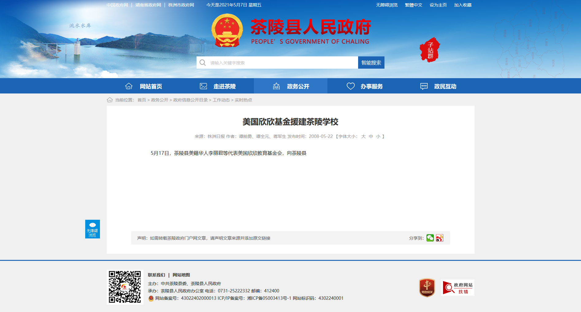 5月17日,茶陵县美籍华人李丽君等代表美国欣欣教育基金会,向茶陵县