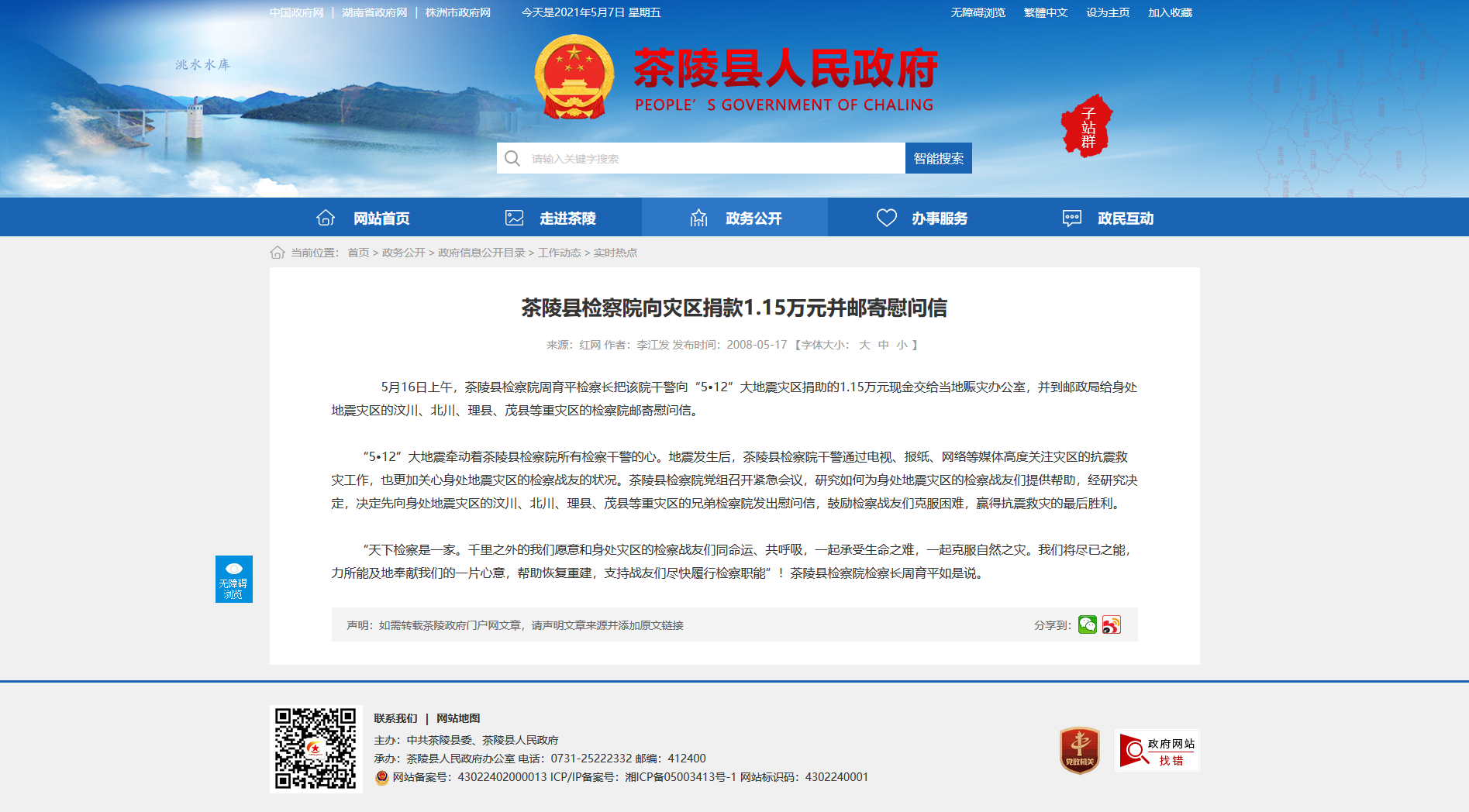 5月16日上午,茶陵县检察院周育平检察长把该院干警向“5•12”大地震灾区捐助的1.15万元现金交给当地赈灾办公室,并到邮政局给身处地震灾区的汶川、北川、理县、茂县等重灾区的检察院邮寄慰问信。