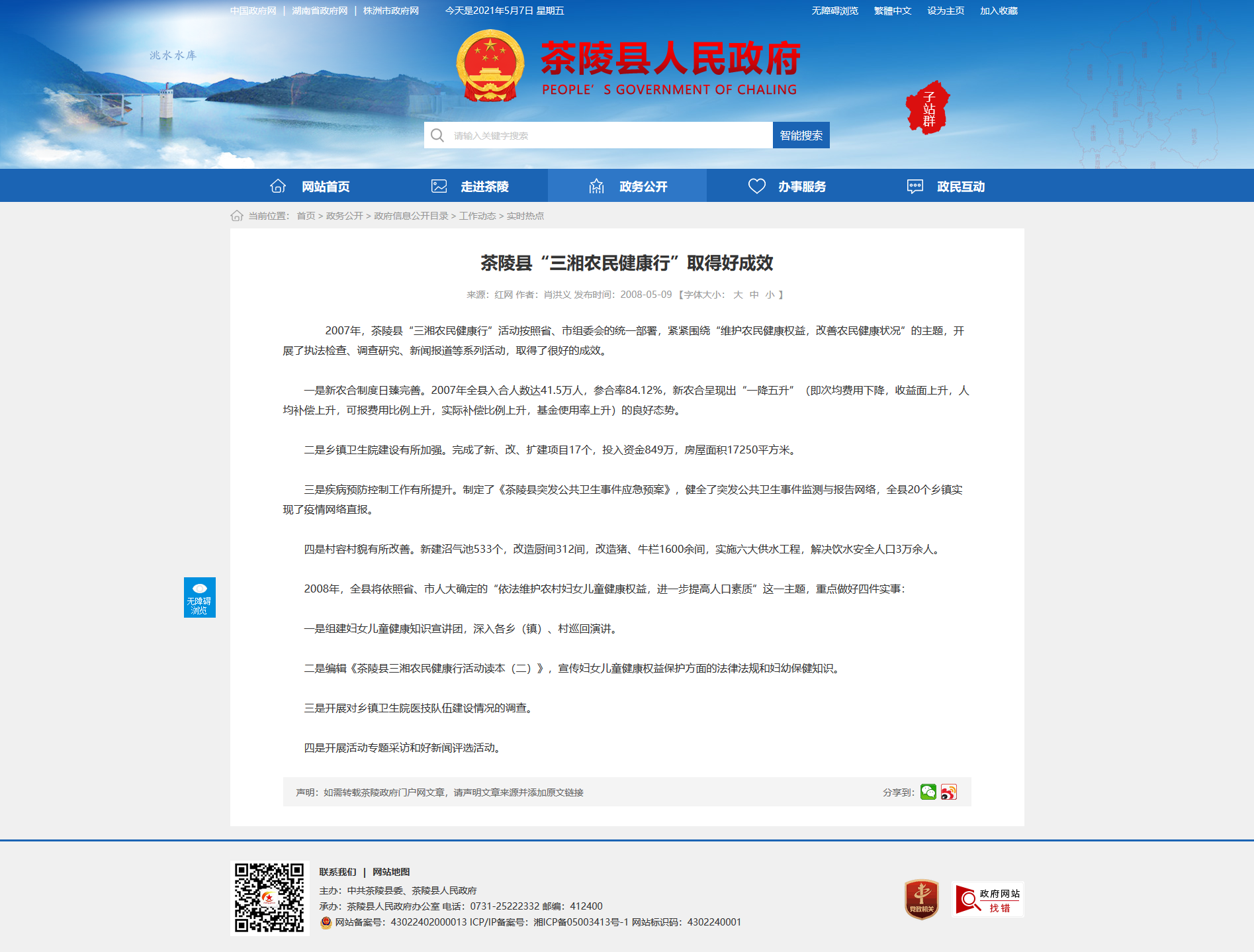 2007年,茶陵县“三湘农民健康行”活动按照省、市组委会的统一部署,紧紧围绕“维护农民健康权益,改善农民健康状况”的主题,开展了执法检查、调查研究、新闻报道等系列活动,取得了很好的成效。