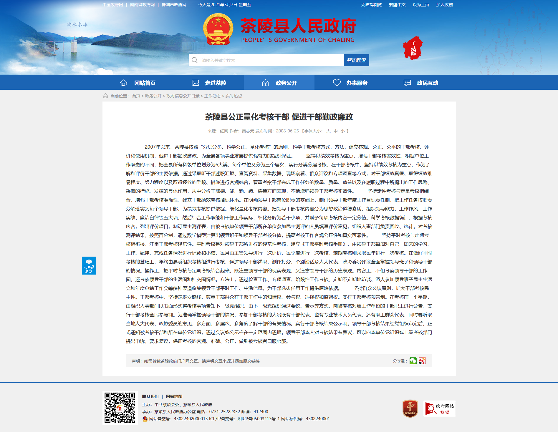 2007年以来,茶陵县按照“分层分类、科学公正、量化考核”的原则,科学干部考核方式,方法,建立客观、公正、公平的干部考核、评价和使用机制,促进干部勤政廉政,为全县各项事业发展提供强有力的组织保证。 坚持以绩效考核为重点,增强干部考核实效性。根据单位工作职责的不同,把全县所有科级单位划分为6大类,每个单位又分为三个层次,实行分类分层考核。在干部考核中,坚持以绩效考核为重点,作为了解和评价干部的主要依据。通过采取听干部述职汇报、查阅资料、采集数据、现场察看、群众评议和专项调查等方式,对干部绩效真假、取得绩效难易程度、努力程度以及取得绩效的手段、措施进行客观综合,着重考察干部完成工作任务的数量、质量、效益以及在履职过程中所提出的工作思路、采取的措施、发挥的具体作用,从中分析干部德、能、勤、绩、廉等方面表现,不断增强领导干部考核实效性。 坚持定性考核与定量考核相结合,增强干部考核准确性。建立干部绩效考核指标体系。在明确领导干部岗位职责的基础上,制订领导干部年度工作目标责任制,把工作任务按职责分解落实到每个领导干部,为绩效考核提供依据。细化量化考核内容。把领导干部考核内容分为思想政治道德素质、组织领导能力、工作作风、工作实绩、廉洁自律等五大项,然后结合工作职能和干部工作实际,细化分解为若干小项,并赋予每项考核内容一定分值。科学考核数据统计。根据考核内容,列出评价项目,制订民主测评表,由被考核单位领导干部所在单位参加民主测评的人员填写评价意见,组织人事部门负责回收、统计。对考核测评结果,按照百分制,通过数学模型计算出领导班子和领导干部考核分值,提高考核工作客观公正性和真实可靠性。 坚持平时考核与定期考核相衔接,注重干部考核经常性。平时考核是对领导干部所进行的经常性考核,建立《干部平时考核手册》,由领导干部每周对自己一周来的学习、工作、纪律、完成任务情况进行记载和小结,每月由主管领导进行一次评价,每季度进行一次考核。定期考核则采取每年进行一次考核。在做好平时考核的基础上,年终由县委组织考核组进行考核,通过领导干部述职、测评打分、个别谈话及人大代表、政协委员评议全面掌握领导班子和领导干部的情况。操作上,把平时考核与定期考核结合起来,既注重领导干部的现实表观,又注意领导干部的历史表观。内容上,不但考察领导干部的工作圈,还考察领导干部的生活圈和社交圈情况。方法上,通过检查工作、专项调查、阶段性工作考核、定期不定期地访谈、派人参加领导班子民主生活会和年度总结工作会等多种渠道收集领导干部平时工作、生活信息,为干部选拔任用工作提供原始依据。 坚持群众公认原则,扩大干部考核民主性。干部考核中,坚持走群众路线,尊重干部群众在干部工作中的知情权、参与权、选择权和监督权。实行干部考核预告制。在考核前一个星期,由组织人事部门以书面形式将考核事项告知下一级党组织,由下一级党组织通过会议、告示等方式,向被考核对象工作单位的干部职工进行公告。实行干部考核全民参与制。为准确掌握领导干部的情况,参加干部考核的人员既有干部代表,也有专业技术人员代表,还有职工群众代表,同时要听取当地人大代表、政协委员的意见,多方面、多层次、多角度了解干部的有关情况。实行干部考核结果公示制。领导干部考核结果经党组织审定后,正式通知被考核干部和所在单位党组织,通过会议或公示栏在一定范围内通报。领导干部本人对考核结果有异议,可以向本单位党组织或上级考核部门提出申诉,要求复议,保证考核的客观、准确、公正,做到被考核者口服心服。