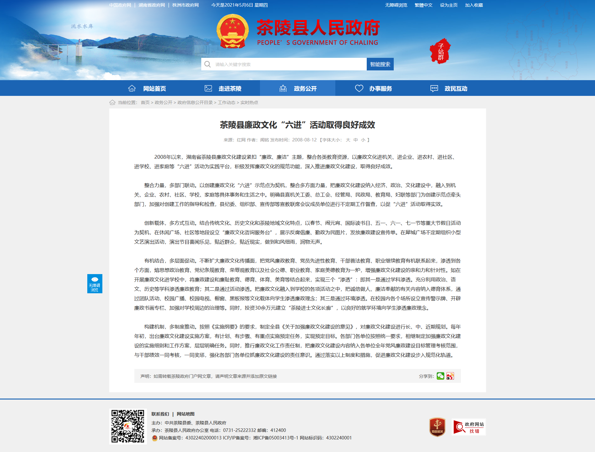 2008年以来,湖南省茶陵县廉政文化建设紧扣“廉政、廉洁”主题,整合各类教育资源,以廉政文化进机关、进企业、进农村、进社区、进学校、进家庭等“六进”活动为实践平台,积极发挥廉政文化的规范功能,深入推进廉政文化建设,取得良好成效。