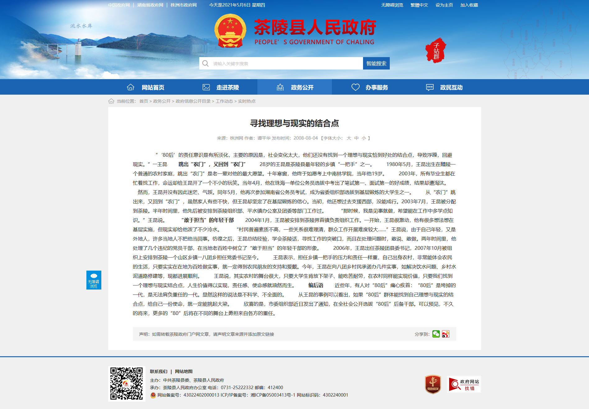 “‘80后’的责任意识是有所淡化,主要的原因是,社会变化太大,他们还没有找到一个理想与现实恰到好处的结合点,导致浮躁,回避现实。”――王昆 跳出“农门”,又回到“农门” 28岁的王昆是茶陵县最年轻的乡镇“一把手”之一。 1980年5月,王昆出生在醴陵一个普通的农村家庭,跳出“农门”是老一辈对他的最大愿望。十年寒窗,他终于如愿考上中南林学院,当年他19岁。 2003年,所有毕业生都在忙着找工作,命运却给王昆开了一个不小的玩笑。当年4月,他在珠海一单位公务员选拔中考出了笔试第一、面试第一的好成绩,结果却遭淘汰。 然而,王昆并没有因此迷茫、气馁。同年5月,他再次参加湖南省公务员考试,成为省委组织部选拔到基层锻炼的大学生之一。 从“农门”跳出来,又回到“农门”,虽然家人有些不快,但王昆却坚定了在基层锻炼的信心。当初,他还想过去支援西部,没能成行。2003年7月,王昆被分配到茶陵。半年时间里,他先后被安排到茶陵组织部、平水镇办公室及团委等部门工作过。 “那时候,我是见事就做,希望能在工作中多学点知识。”王昆说。 “敢于担当”的年轻干部 2004年1月,王昆被安排到茶陵界首镇负责组织工作。一开始,王昆很激动,他有很多想法想在基层实施,但现实却给他泼了不少冷水。 “村民普遍素质不高,一些关系很难理清,群众工作开展难度较大……”王昆说,由于自己年轻,又是外地人,许多当地人不把他当回事。彷徨之后,王昆总结经验,学会茶陵话,寻找工作的突破口,而且在处理问题时,敢说、敢做。两年时间里,他处理了几个违纪的党员干部,在当地老百姓中树立了“敢于担当”的年轻干部的形象。 2006年,王昆出任茶陵团县委书记,2007年10月被组织上安排到茶陵一个山区乡镇――八团乡担任党委书记至今。 王昆表示,担任乡镇一把手的压力和责任一样重,自己出身农村,非常能体会农民的生活,只要实实在在地为百姓做实事,就一定得到农民朋友的支持和爱戴。今年,王昆在向八团乡村民承诺办几件实事,如解决饮水问题、乡村水泥道路修建等,现都进展顺利。 王昆说,其实农村的舞台很大,只要大学生肯放下架子、能吃苦耐劳,在农村同样能实现价值,只要我们找到一个理想与现实结合点,人生价值得以实现,责任感、使命感就油然而生。 编后语 近些年,有人对“80后”痛心疾首:“80后”是垮掉的一代,是无法肩负重任的一代。显然这样的说法是不科学、不全面的。 从王昆的事例可以看出,如果“80后”群体能找到自己理想与现实的结合点,给自己一份使命,就一定能挑起大梁。 欣喜的是,市委组织部近日发出了通知,在全社会公开选拔“80后”后备干部。可以预见,不久的将来,更多的“80”后将在不同的舞台上勇担来自各方的重任。