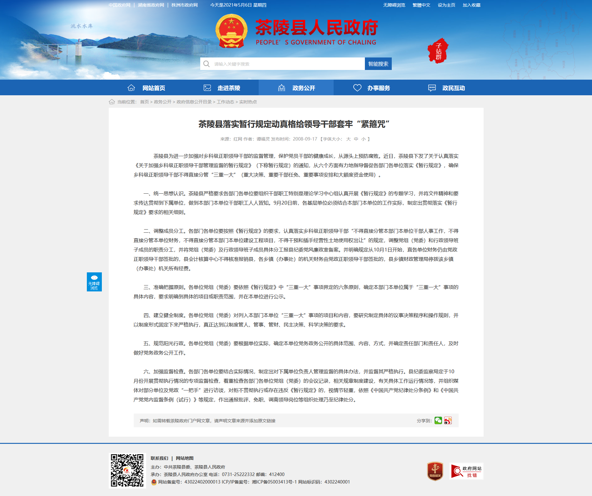 茶陵县为进一步加强对乡科级正职领导干部的监督管理,保护党员干部的健康成长,从源头上预防腐败。近日,茶陵县下发了关于认真落实《关于加强乡科级正职领导干部管理监督的暂行规定》(下称暂行规定)的通知,从六个方面有力地指导督促各部门各单位落实《暂行规定》,确保乡科级正职领导干部不得直接分管“三重一大”(重大决策、重要干部任免、重要事项安排和大额度资金使用)。