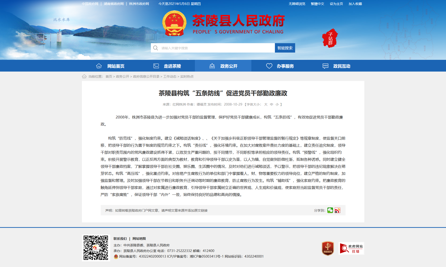 2008年,株洲市茶陵县为进一步加强对党员干部的监督管理,保护好党员干部健康成长,构筑“五条防线”,有效地促进党员干部勤政廉政。