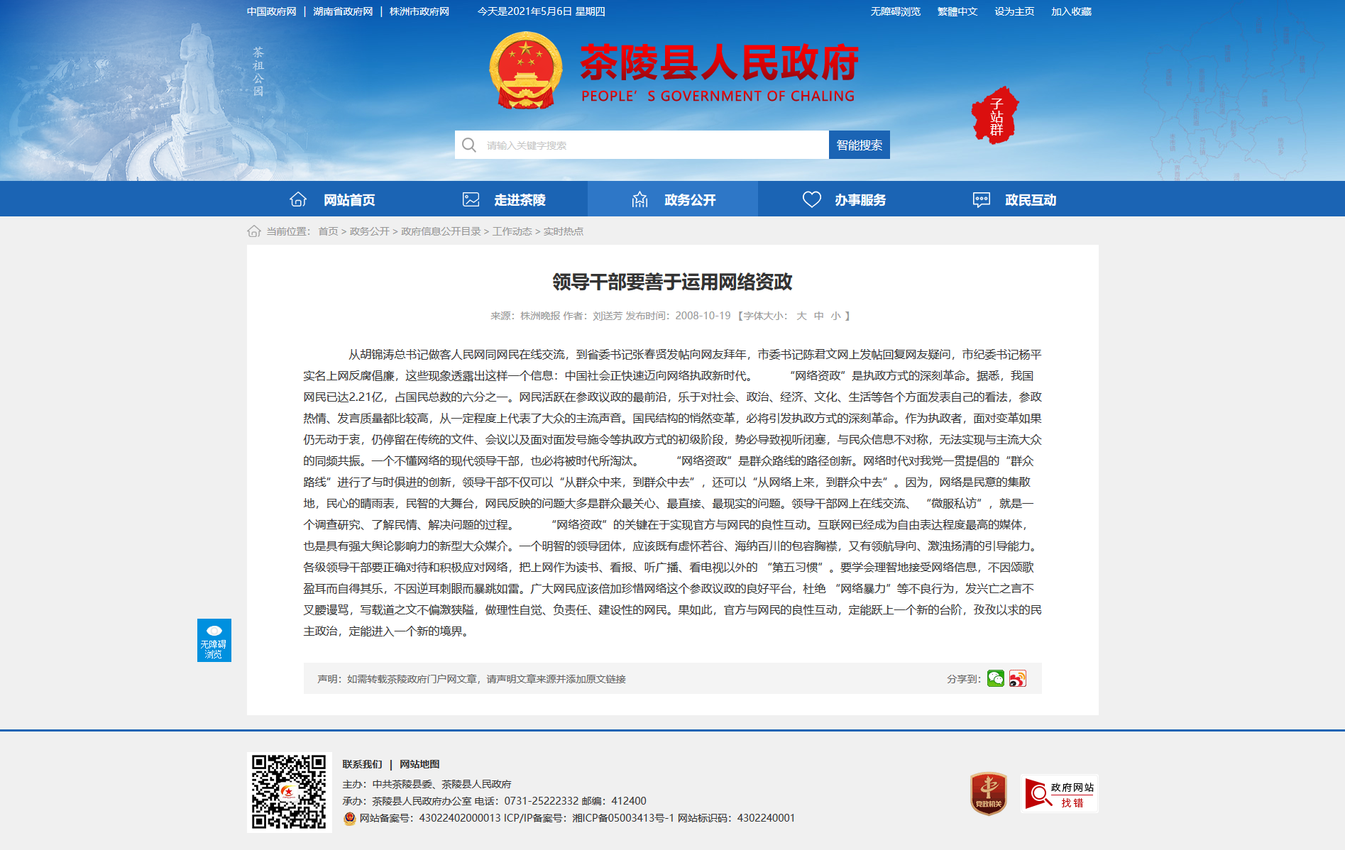 从胡锦涛总书记做客人民网同网民在线交流,到省委书记张春贤发帖向网友拜年,市委书记陈君文网上发帖回复网友疑问,市纪委书记杨平实名上网反腐倡廉,这些现象透露出这样一个信息:中国社会正快速迈向网络执政新时代。 “网络资政”是执政方式的深刻革命。据悉,我国网民已达2.21亿,占国民总数的六分之一。网民活跃在参政议政的最前沿,乐于对社会、政治、经济、文化、生活等各个方面发表自己的看法,参政热情、发言质量都比较高,从一定程度上代表了大众的主流声音。国民结构的悄然变革,必将引发执政方式的深刻革命。作为执政者,面对变革如果仍无动于衷,仍停留在传统的文件、会议以及面对面发号施令等执政方式的初级阶段,势必导致视听闭塞,与民众信息不对称,无法实现与主流大众的同频共振。一个不懂网络的现代领导干部,也必将被时代所淘汰。 “网络资政”是群众路线的路径创新。网络时代对我党一贯提倡的“群众路线”进行了与时俱进的创新,领导干部不仅可以“从群众中来,到群众中去”,还可以“从网络上来,到群众中去”。因为,网络是民意的集散地,民心的晴雨表,民智的大舞台,网民反映的问题大多是群众最关心、最直接、最现实的问题。领导干部网上在线交流、 “微服私访”,就是一个调查研究、了解民情、解决问题的过程。 “网络资政”的关键在于实现官方与网民的良性互动。互联网已经成为自由表达程度最高的媒体,也是具有强大舆论影响力的新型大众媒介。一个明智的领导团体,应该既有虚怀若谷、海纳百川的包容胸襟,又有领航导向、激浊扬清的引导能力。各级领导干部要正确对待和积极应对网络,把上网作为读书、看报、听广播、看电视以外的 “第五习惯”。要学会理智地接受网络信息,不因颂歌盈耳而自得其乐,不因逆耳刺眼而暴跳如雷。广大网民应该倍加珍惜网络这个参政议政的良好平台,杜绝 “网络暴力”等不良行为,发兴亡之言不叉腰谩骂,写载道之文不偏激狭隘,做理性自觉、负责任、建设性的网民。果如此,官方与网民的良性互动,定能跃上一个新的台阶,孜孜以求的民主政治,定能进入一个新的境界。