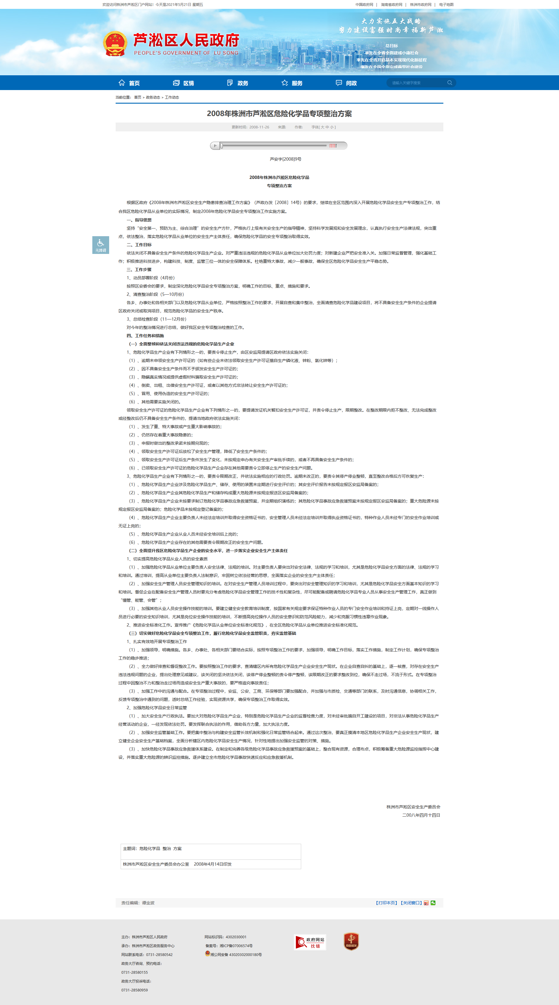(三)切实做好危险化学品安全专项整治工作,履行危险化学品安全监管职责,夯实监管基础1、扎实有效地开展专项整治工作(1)、加强领导,明确措施。各乡、办事处、各相关部门要结合实际,按照专项整治工作的要求,加强领导,明确工作目标,落实工作措施,制定工作计划,确保专项整治工作的稳步推进;(2)、全力做好排查和督促整改工作。要按照整治工作的要求,查清辖区内所有危险化学品生产企业安全生产现状。在企业自查自纠的基础上,逐一核查,对存在安全生产违法违规问题的企业,提出处理意见或建议,该关闭的坚决依法关闭,该停产停业整顿的责令停产整顿,该限期改正的要求整改到位,确保不走过场,不流于形式。在专项整治过程中因整治不力和整治走过场而造成安全生产重大事故的,要严格追究事故责任;(3)、加强工作中的沟通与配合。在专项整治过程中,安监、公安、工商、环保等部门要加强配合,并加强与市质检、交通等部门的联系,及时沟通信息,协调相关工作,反馈专项整治中遇到的问题,适时总结工作经验,实现资源共享,确保专项整治工作取得实效。2、加强危险化学品安全日常监管(1)、加大安全生产行政执法。要加大对危险化学品生产企业,特别是危险化学品生产企业的监督检查力度,对未经审批擅自开工建设的项目,对非法从事危险化学品生产经营活动的企业,一经发现依法处罚。要发挥联合执法的作用,借助各方力量,加大执法力度。(2)、加强安全监管基础工作。要把集中整治与构建安全监管长效机制和强化日常监管结合起来。通过这次整治,要真正摸清本地区危险化学品生产企业安全生产现状,建立健全企业安全生产基础档案,全面分析辖区内危险化学品安全生产情况,针对性地提出加强安全监管的对策、措施。(3)、加快危险化学品事故应急救援体系建设。在制定和完善各级危险化学品事故应急救援预案的基础上,整合现有资源,合理布点,积极筹备重大危险源监控指挥中心建设,并落实重大危险源的辨识监控措施。逐步建立全市危险化学品事故快速反应和应急救援机制。 株洲市芦淞区安全生产委员会二00八年四月十四日