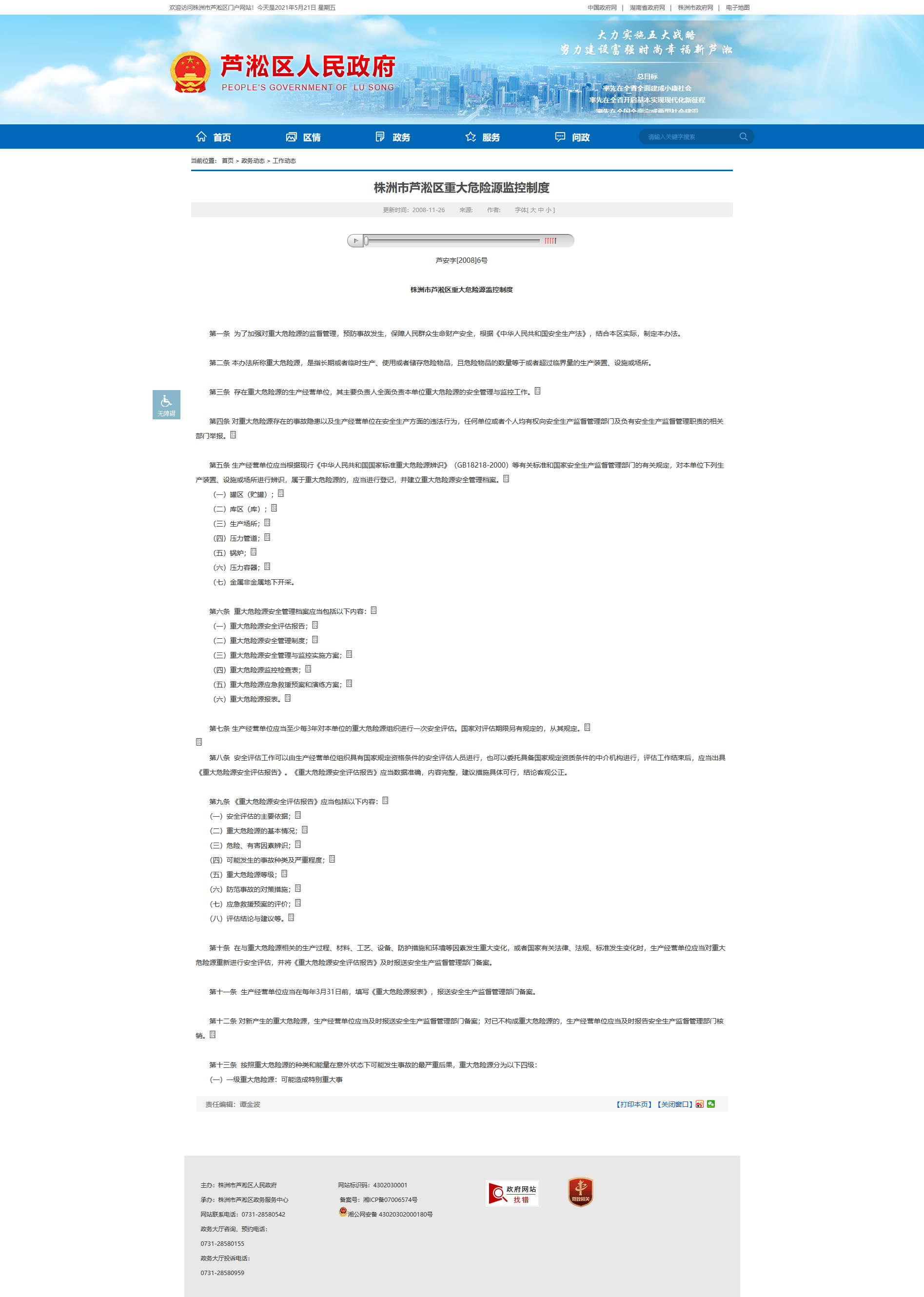 株洲市芦淞区重大危险源监控制度