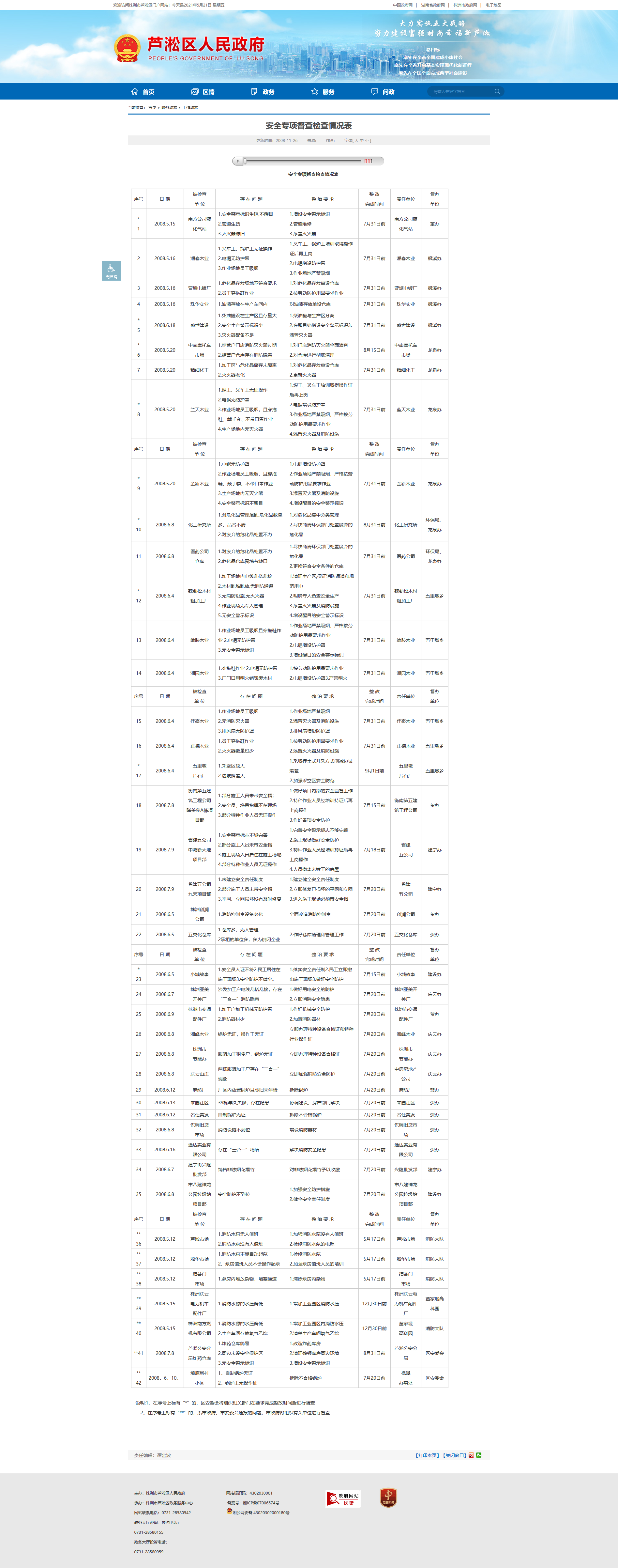 | **41 | 2008.7.8 | 芦淞公安分局炸药仓库 | 1.炸药仓库简易 2.周边未设安全保护区 3.无安全警示标识 | 1.改造炸药库房 2.清理整顿库房周边环境 3.增设安全警示标识 | 8月31日前 | 芦淞公安分局 | 区安委会 |