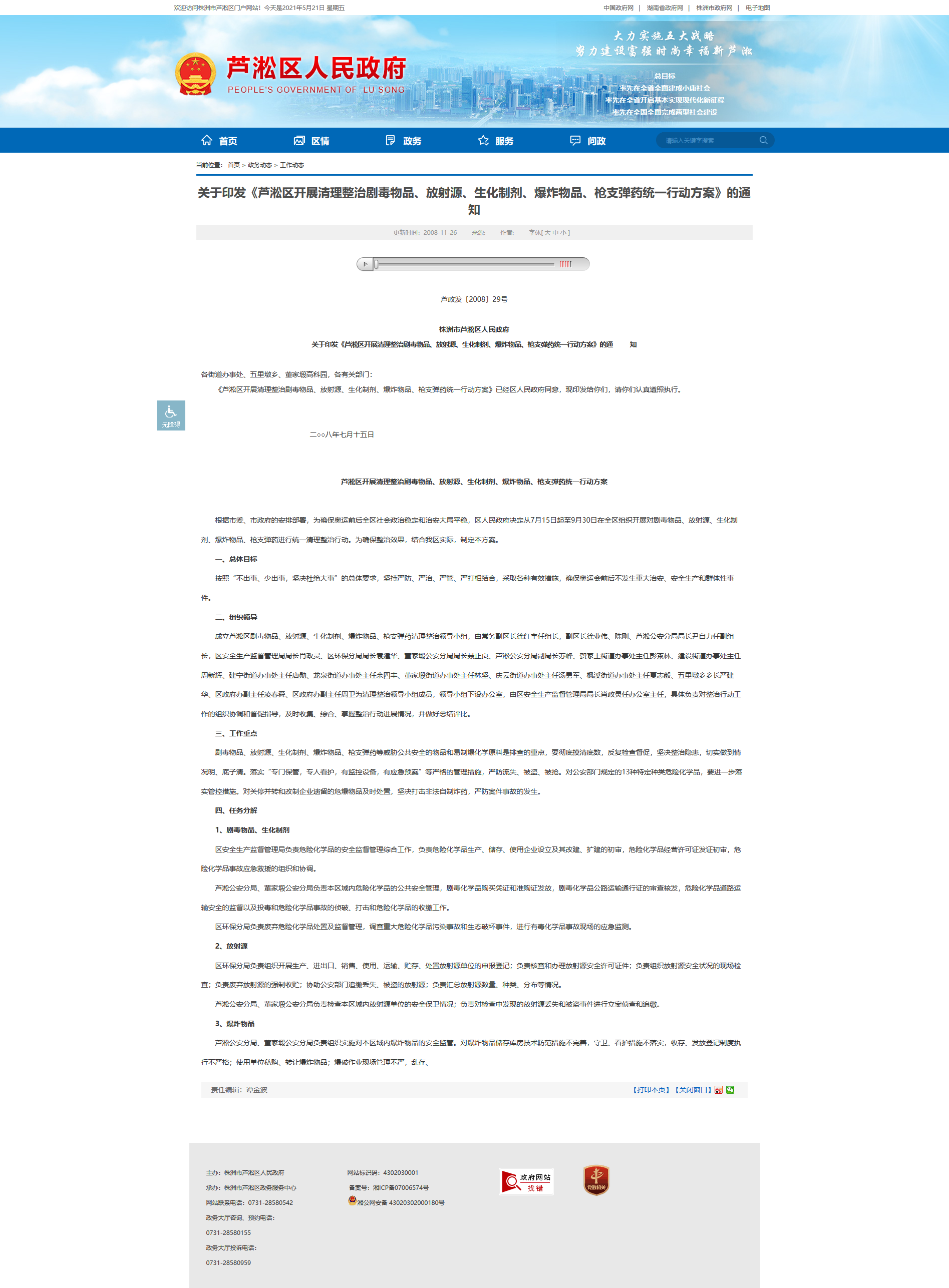 各街道办事处、五里墩乡、董家塅高科园,各有关部门:《芦淞区开展清理整治剧毒物品、放射源、生化制剂、爆炸物品、枪支弹药统一行动方案》已经区人民政府同意,现印发给你们,请你们认真遵照执行。 二○○八年七月十五日