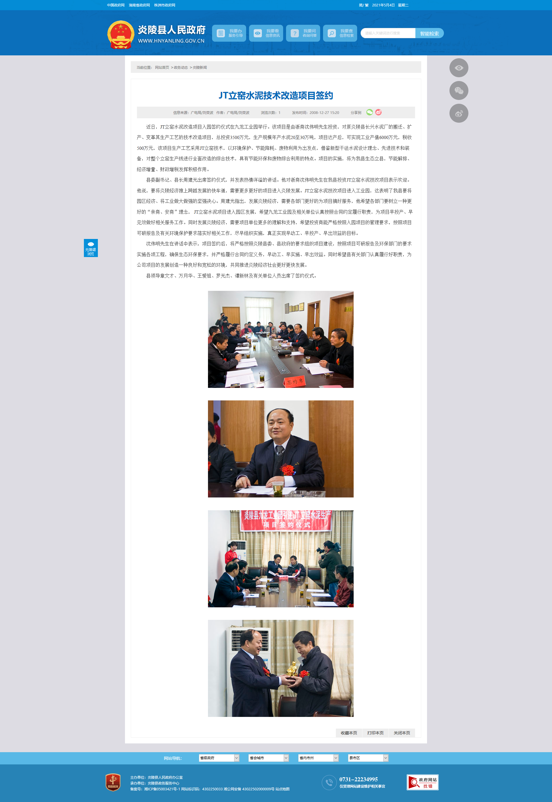 近日,JT立窑水泥改造项目入园签约仪式在九龙工业园举行。该项目是由浙商沈伟明先生投资,对原炎陵县长兴水泥厂的搬迁、扩产、变革其生产工艺的技术改造项目,总投资3500万元,生产规模年产水泥20至30万吨,项目达产后,可实现工业产值6000万元,税收500万元,该项目生产工艺采用JT立窑技术,以环境保护、节能降耗、废物利用为出发点,借鉴新型干法水泥设计理念、先进技术和装备,对整个立窑生产线进行全面改造的综合技术,具有节能环保和废物综合利用的特点。项目的实施,将为我县生态立县,节能解排、经济增量、财政增税发挥积极作用。