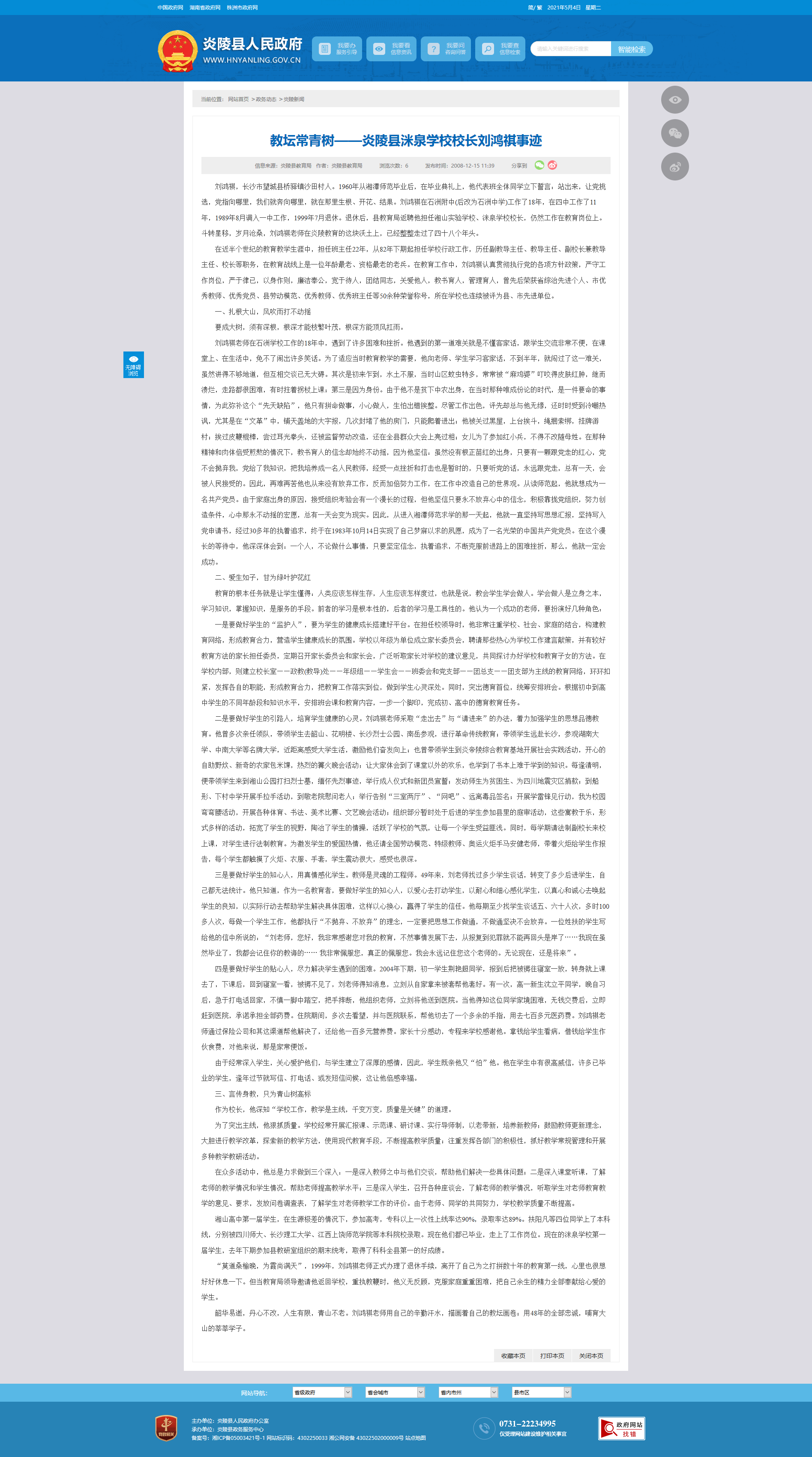 二是要做好学生的引路人,培育学生健康的心灵。刘鸿祺老师采取“走出去”与“请进来”的办法,着力加强学生的思想品德教育。他曾多次亲任领队,带领学生去韶山、花明楼、长沙烈士公园、南岳参观,进行革命传统教育;带领学生远赴长沙,参观湖南大学、中南大学等名牌大学,近距离感受大学生活,激励他们奋发向上;也曾带领学生到炎帝陵综合教育基地开展社会实践活动,开心的自助野炊、新奇的农家包米馃,热烈的篝火晚会活动;让大家体会到了课堂以外的欢乐,也学到了书本上难于学到的知识。每逢清明,便带领学生来到湘山公园打扫烈士墓,缅怀先烈事迹,举行成人仪式和新团员宣誓;发动师生为贫困生、为四川地震灾区捐款;到船形、下村中学开展手拉手活动,到敬老院慰问老人;举行告别“三室两厅”、“网吧”、远离毒品签名;开展学雷锋见行动,我为校园弯弯腰活动,开展各种体育、书法、美术比赛、文艺晚会活动;组织部分暂时处于后进的学生参加县里的庭审活动,这些寓教于乐,形式多样的活动,拓宽了学生的视野,陶冶了学生的情操,活跃了学校的气氛,让每一个学生受益匪浅。同时,每学期请法制副校长来校上课,对学生进行法制教育。为激发学生的爱国热情,他还请全国劳动模范、特级教师、奥运火炬手马安健老师,带着火炬给学生作报告,每个学生都触摸了火炬、衣服、手套,学生震动很大,感受也很深。