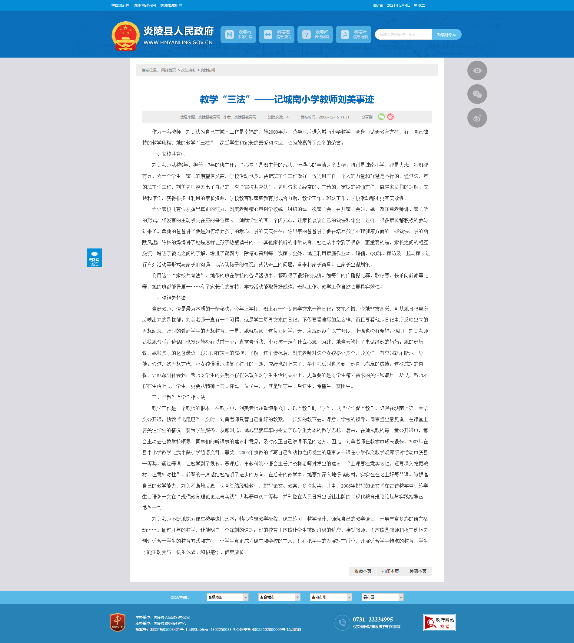 教学工作是一个教师的根本。在教学中,刘美老师注重博采众长,以“教”助“学”,以“学”促“教”。记得在城南上第一堂语文公开课,执教《比尾巴》一文时,刘美老师只管自己备好的教案,一步步的教下去。课后,学校的领导、同事提出意见说,在课堂上要关注学生的情况,要为学生服务。从那时起,她心里就牢牢的树立了以学生为本的教学思想。后来,在她执教的每一堂公开课中,都会主动去征救学校领导、同事们的听课事的建议和意见,及时改正自己讲课不足的地方。因此,刘美老师在教学中成长很快。2003年在县中小学教学比武中获小学组语文科二等奖。2005年执教的《写自己和动物之间发生的趣事》一课在小学作文教学观摩研讨活动中获县一等奖。通过赛课,让她学到了很多。赛课后,市教科院小语会主任帅晓梅老师对提出的建议:“上课要注意实效性,还要深入挖掘教材,注意针对性”。前辈的一席话给她指明了进步的方向。在后来的教学中,她更加深入地研读教材,实实在在地上好每节课。为提高自己的教学能力,刘美不断地反思,认真总结经验教训,撰写论文、教案,多次获奖。其中,2006年撰写的论文《在古诗教学中训练学生口语》一文在“现代教育理论论坛与实践”大奖赛中获二等奖,并刊登在人民日报出版社出版的《现代教育理论论坛与实践指导丛书》一书。