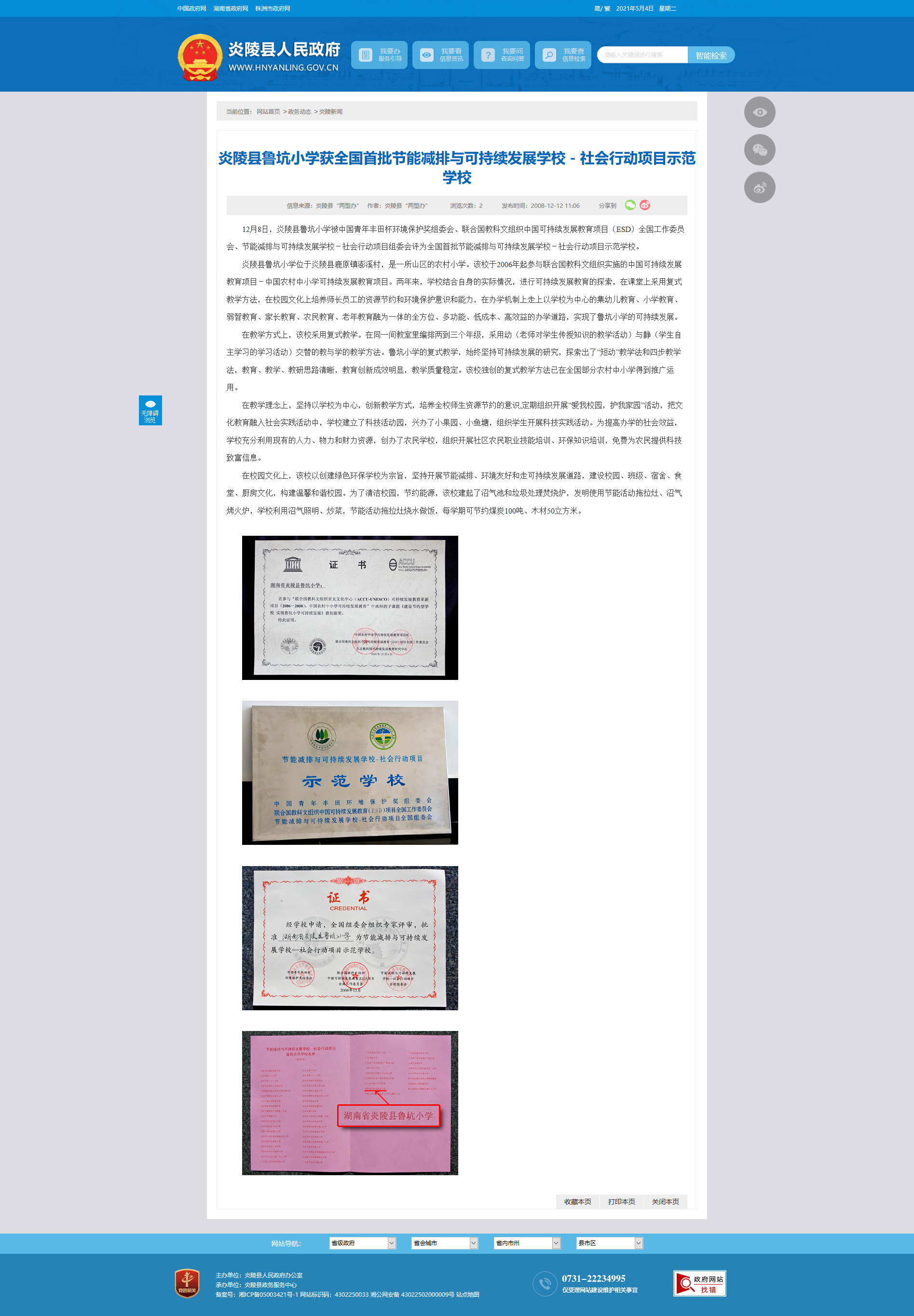 炎陵县鲁坑小学位于炎陵县鹿原镇澎溪村,是一所山区的农村小学。该校于2006年起参与联合国教科文组织实施的中国可持续发展教育项目-中国农村中小学可持续发展教育项目。两年来,学校结合自身的实际情况,进行可持续发展教育的探索,在课堂上采用复式教学方法,在校园文化上培养师长员工的资源节约和环境保护意识和能力,在办学机制上走上以学校为中心的集幼儿教育、小学教育、弱智教育、家长教育、农民教育、老年教育融为一体的全方位、多功能、低成本、高效益的办学道路,实现了鲁坑小学的可持续发展。