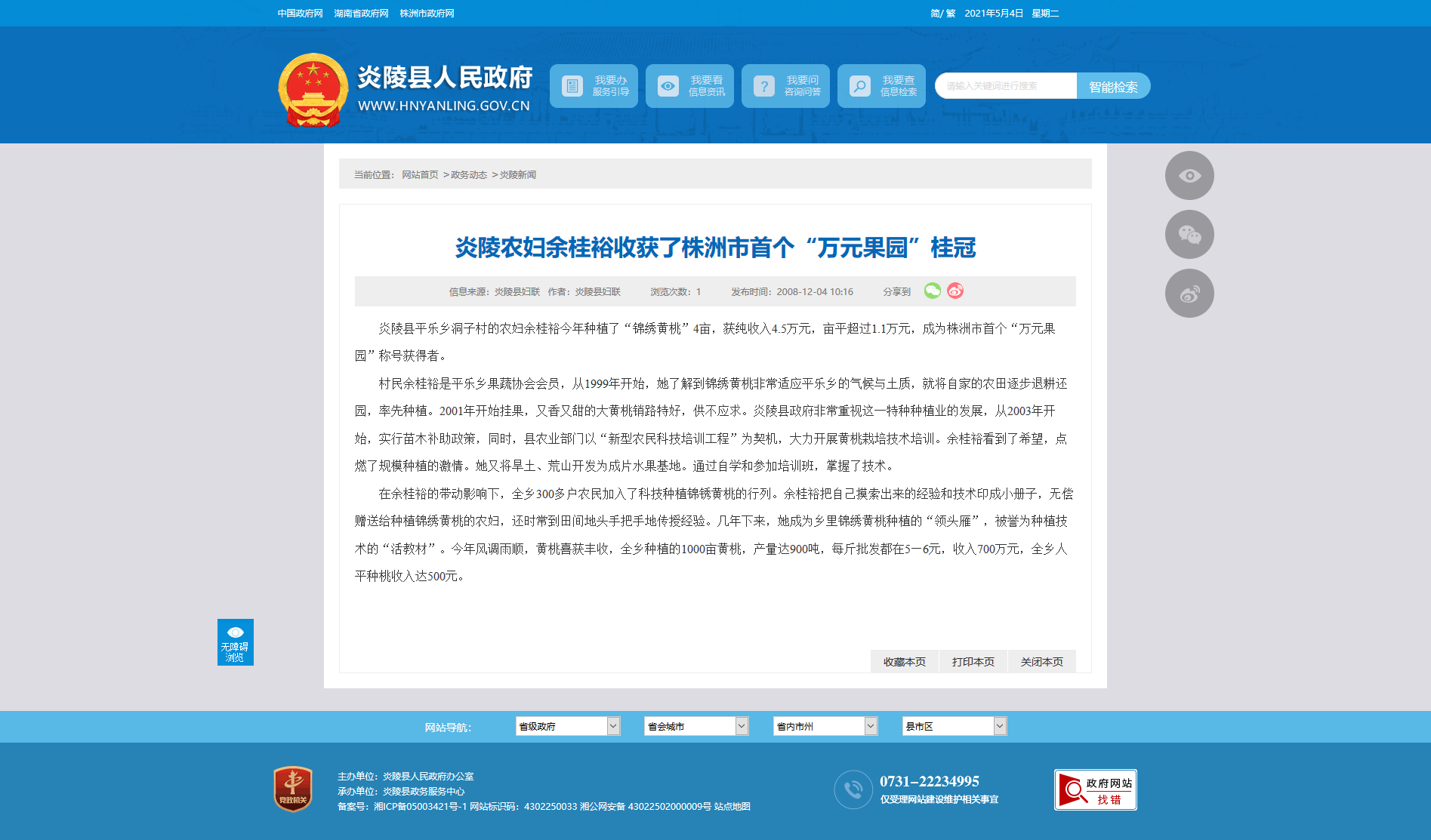 炎陵县平乐乡洞子村的农妇余桂裕今年种植了“锦绣黄桃”4亩,获纯收入4.5万元,亩平超过1.1万元,成为株洲市首个“万元果园”称号获得者。