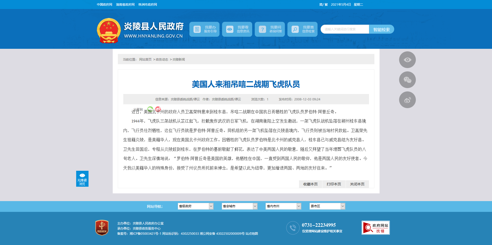 近日,美国北卡州的政府人员卫高荣特意来到桂东县,吊唁二战期在中国抗日而牺牲的飞虎队员罗伯特·阿普丘奇。