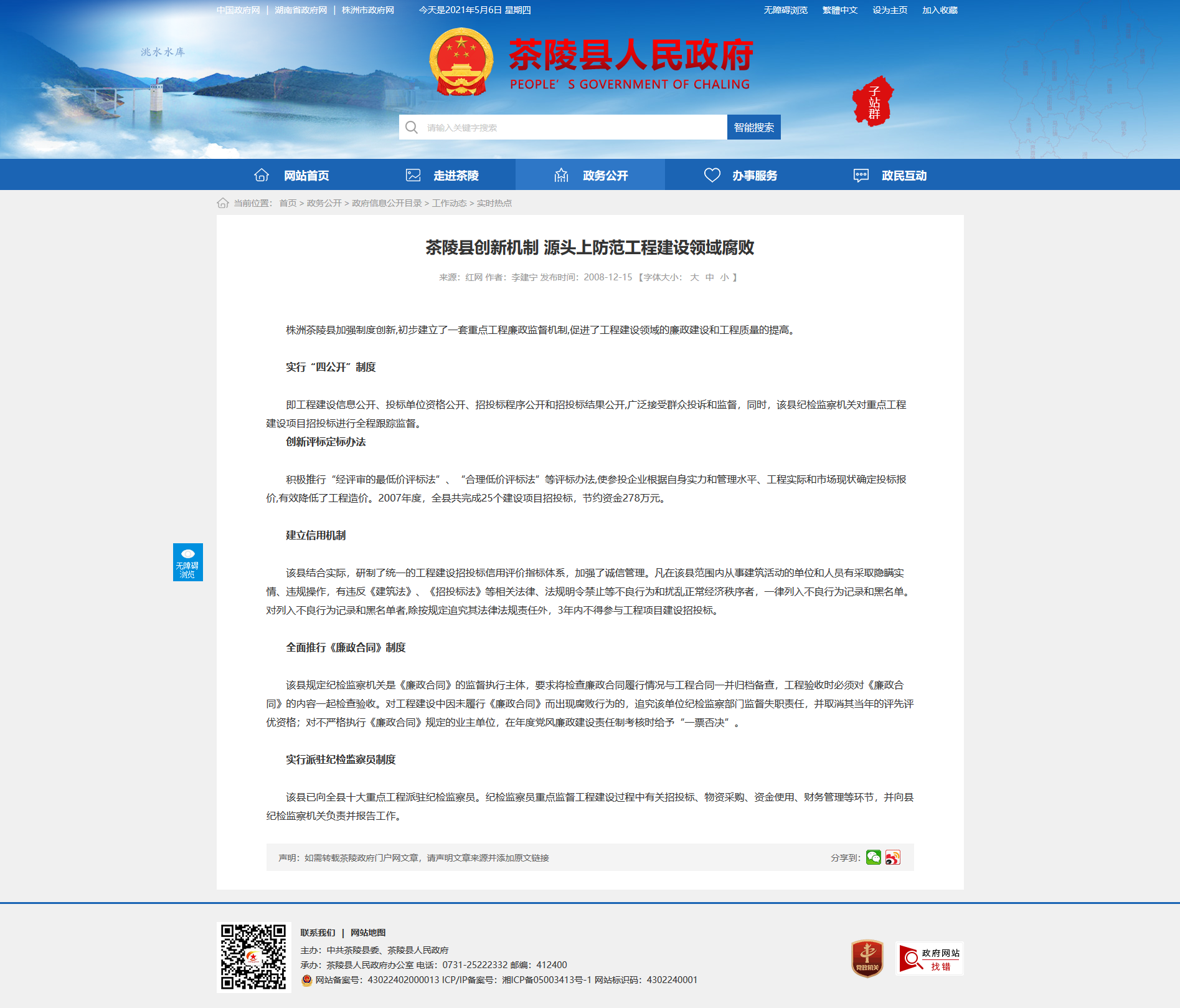 株洲茶陵县加强制度创新,初步建立了一套重点工程廉政监督机制,促进了工程建设领域的廉政建设和工程质量的提高。