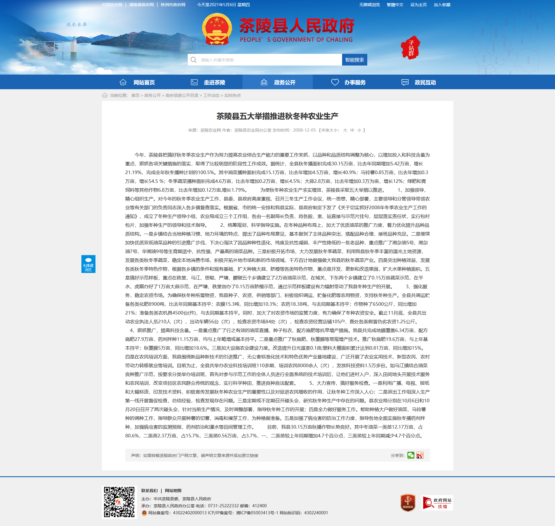 今年,茶陵县把搞好秋冬季农业生产作为努力提高农业综合生产能力的重要工作来抓,以品种和品质结构调整为核心,以增加投入和科技含量为重点,狠抓各项关键措施的落实,取得了比较明显的阶段性工作成效。据统计,全县秋冬播面积完成30.15万亩,比去年同期增加5.42万亩,增长21.19%,完成全年秋冬播种计划的100.5%。其中油菜播种面积完成15.1万亩,比去年增加4.5万亩,增长40.9%;马铃薯0.85万亩,比去年增加0.3万亩,增长54.5 %;冬季蔬菜播种面积完成4.6万亩,比去年增加0.2万亩,增长4.5%;大蒜2.8万亩,比去年增加0.3万为亩,增长12%;绿肥和青饲料等其他作物6.8万亩,比去年增加0.12万亩,增长1.79%。 为使秋冬种农业生产求实增效,茶陵县采取五大举措以推进。 1、加强领导,精心组织生产。对今年的秋冬季农业生产工作,县委、县政府高度重视,召开三冬生产工作会议,统一思想,精心部署,主要领导和分管领导带领农业等有关部门的负责同志深入各乡镇督查落实。根据省、市的统一安排和我县实际,县政府制定下发了《关于切实抓好2008年冬季农业生产工作的通知》,成立了冬种生产领导小组,农业局成立三个工作组,各由一名副局长负责,将各股、室、站直接与示范片挂勾,层层落实责任状,实行包村包片,加强冬种生产的领导和技术指导。 2、统筹规划,科学指导实施。在冬种品种布局上,加大了优质油菜的推广力度,着力优化提升品种品质结构。一是乡镇结合当地种植习惯、地力环境的特点,提出了品种布局意见,基本做到了主体品种突出,搭配品种合理,接班品种充足。二是继续加快优质双低油菜品种的引进推广步伐,下决心淘汰了因品种种性退化、纯度及抗性减弱、丰产性降低的一批老品种,重点推广了湘杂油5号、湘杂油7号、华湘油9号等生育期适中、抗性强、产量高的油菜品种。三是积极开拓市场,大力发展秋冬季蔬菜,利用我县秋冬季丰富的温光土地资源,发展各类秋冬季蔬菜,稳定本地消费市场,积极开拓外地市场和新的市场领域,千方百计地做强做大我县的秋冬蔬菜产业。四是突出种植效益,发展各类秋冬季特色作物,根据各乡镇的条件和现有基础,扩大种植大蒜、脐橙等各类特色作物,重点是开发、更新和改造果园,扩大水果种植面积。五是搞好示范样板,重点在秩堂、马江、思聪、严塘、腰陂五个乡镇建立了2万亩油菜示范,在城关、下东两个乡镇建立了0.15万亩蔬菜示范,在平水、虎踞办好了1万亩大蒜示范,在严塘、秩堂创办了0.15万亩脐橙示范,通过示范样板建设有力辐射带动了我县冬种生产的开展。 3、强化服务,稳定农资市场。为确保秋冬种所需物资,我县种子、农资、供销等部门,积极组织调运、贮备化肥等农用物资,支持秋冬种生产。全县共调运贮备各类化肥8900吨,比去年同期基本持平;农膜15.3吨,同比增加10.3%;农药18.38吨,与去同期基本持平;作物种了6500公斤,同比增加21%;准备各类农机具4500台(件),与去同期基本持平。同时,加大了对农资市场的监管力度,有力确保了冬种农资安全。截止11月底,全县共出动农业执法人员210人(次),出动车辆56台(次),检查农资市场84处(次),检查农资经营店铺105户,查处各类假冒伪劣农资1.25公斤。 4、狠抓推广,提高科技含量。一是重点推广了行之有效的油菜直播、种子包衣、配方施肥等抗旱增产措施。我县共完成地膜覆盖6.34万亩,配方施肥27.9万亩,药剂拌种11.15万亩,均与上年略增或基本持平。二是重点推广了秋施肥、秋覆膜等常规增产技术。推广秋施肥19.6万亩,与上年基本持平;秋覆膜5万亩,同比增加18.6%。三是加大设施农业建设力度。改造提升日光温室0.1亩;塑料大棚面积累计达到0.81万亩,同比增加15%。四是在农民培训方面,我县围绕新品种新技术的引进推广、无公害标准化技术和特色优势产业基地建设,广泛开展了农业实用技术、新型农民、农村劳动力转移就业等培训。目前为止,全县共举办农业科技培训班110多期,培训农民8000余人(次),发放科技资料1.5万多份。如马江镇结合油菜良种推广示范,按要求分类举办培训班,首先对参与示范工作的全体人员进行全面系统的技术培训后,让他们进村入户,深入田间地头开展技术服务和农民培训,改变项目区农民群众传统的观念,实行科学种田,推进良种良法配套。 5、大力宣传,搞好服务检查。一是利用广播、电视、报纸和大幅标语,印发技术资料,积极宣传发展秋冬种农业生产的重要性以及对促进农民增收的作用,让秋冬种工作深入人心;二是派出工作组深入生产第一线开展督促检查,总结经验,检查发现存在问题。三是定期或不定期召开碰头会,研究秋冬种生产中存在的问题。县农业局分别在10月6日和10月20日召开了两次碰头会,针对当前生产情况,及时调整部署,指导秋冬种工作的开展;四是全力做好服务工作。帮助种植大户做好油菜、马铃薯种的调种工作,指导群众开展种薯的切薯、消毒和催芽工作,为种植做准备。五是加强了病虫害的防治工作力度,指导各地全面实施秋冬播药剂拌种,加强病虫害的监测预报、药剂防治和灌水等田间管理工作。 目前,我县30.15万亩秋播作物长势良好。其中冬油菜一类苗12.17万亩、占80.6%,二类苗2.37万亩、占15.7%,三类苗0.56万亩、占3.7%,一、二类苗较上年同期增加4.7个百分点,三类苗较上年同期减少4.7个百分点。