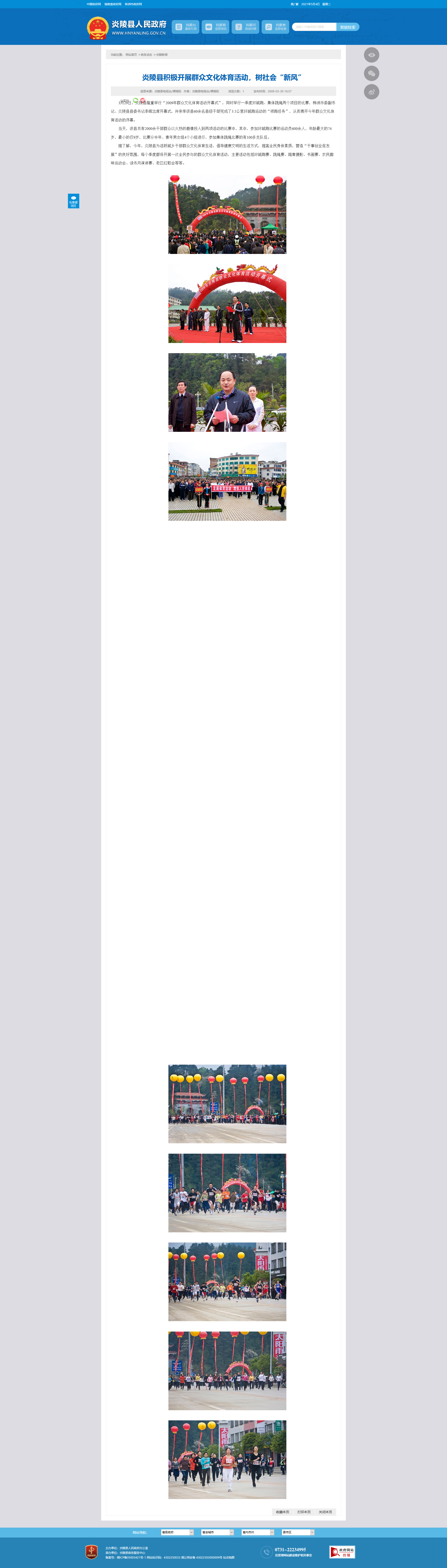 3月29日,炎陵县隆重举行“2009年群众文化体育活动开幕式”,同时举行一季度环城跑、集体跳绳两个项目的比赛,株洲市委副书记、炎陵县县委书记李晖出席开幕式,并亲率该县60余名县级干部完成了3.5公里环城跑运动的“领跑任务”,从而揭开今年群众文化体育活动的序幕。