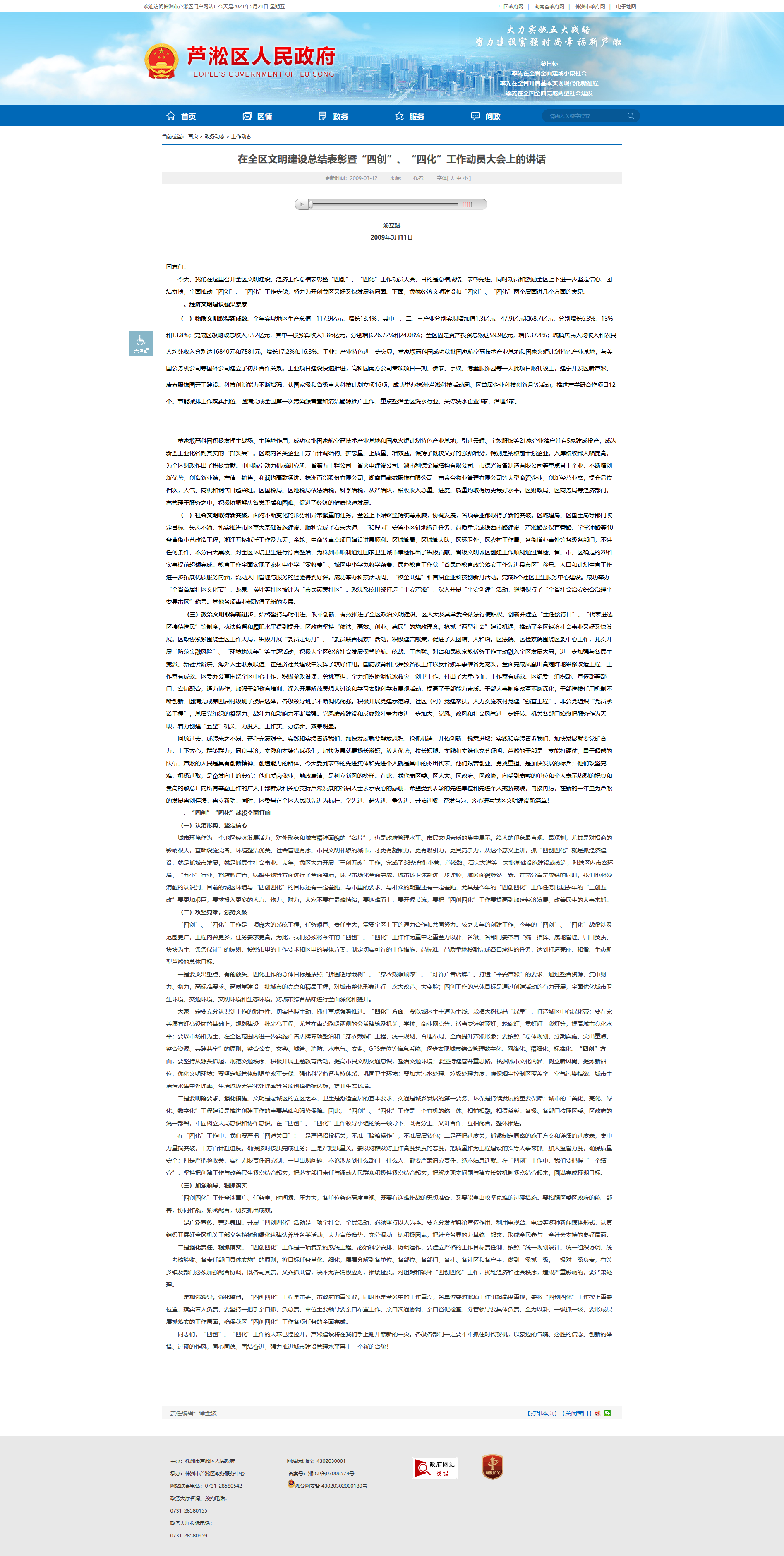 “四创四化”工程是市委、市政府的重头戏,同时也是全区中的工作重点,各单位要对此项工作引起高度重视,要将“四创四化”工作摆上重要位置,落实专人负责,要坚持一把手亲自抓,负总责。单位主要领导要亲自布置工作,亲自沟通协调,亲自督促检查,分管领导要具体负责、全力以赴,一级抓一级,要形成层层抓落实的工作局面,确保我区“四创四化”工作各项任务的全面完成。同志们,“四创”、“四化”工作的大幕已经拉开,芦淞建设将在我们手上翻开崭新的一页。各级各部门一定要牢牢抓住时代契机,以豪迈的气魄、必胜的信念、创新的举措、过硬的作风,同心同德,团结奋进,强力推进城市建设管理水平再上一个新的台阶!
