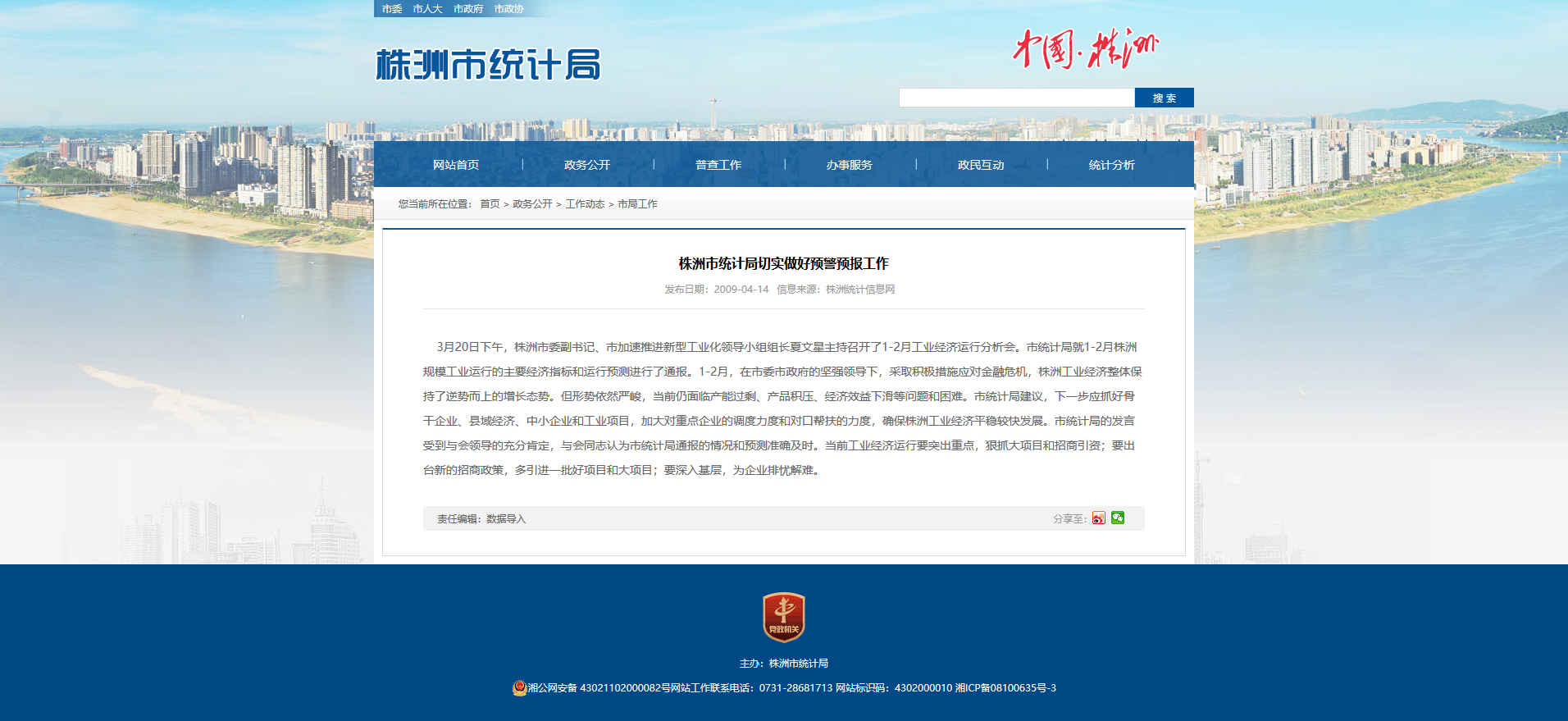 3月20日下午,株洲市委副书记、市加速推进新型工业化领导小组组长夏文星主持召开了1-2月工业经济运行分析会。市统计局就1-2月株洲规模工业运行的主要经济指标和运行预测进行了通报。1-2月,在市委市政府的坚强领导下,采取积极措施应对金融危机,株洲工业经济整体保持了逆势而上的增长态势。但形势依然严峻,当前仍面临产能过剩、产品积压、经济效益下滑等问题和困难。市统计局建议,下一步应抓好骨干企业、县域经济、中小企业和工业项目,加大对重点企业的调度力度和对口帮扶的力度,确保株洲工业经济平稳较快发展。市统计局的发言受到与会领导的充分肯定,与会同志认为市统计局通报的情况和预测准确及时。当前工业经济运行要突出重点,狠抓大项目和招商引资;要出台新的招商政策,多引进一批好项目和大项目;要深入基层,为企业排忧解难。