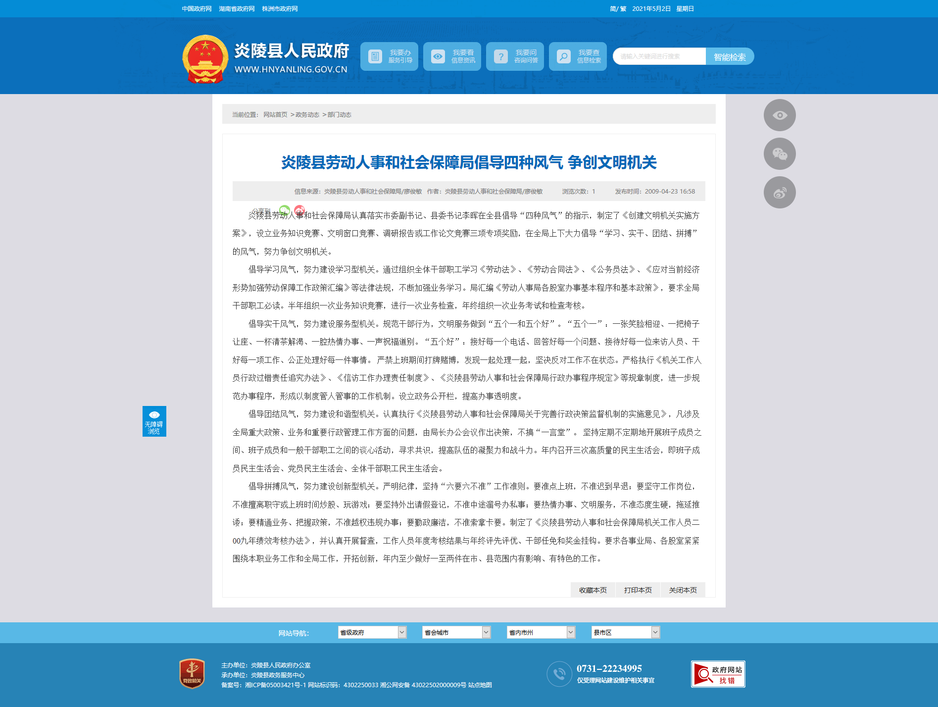 倡导实干风气,努力建设服务型机关。规范干部行为,文明服务做到“五个一和五个好”。“五个一”:一张笑脸相迎、一把椅子让座、一杯清茶解渴、一腔热情办事、一声祝福道别。“五个好”:接好每一个电话、回答好每一个问题、接待好每一位来访人员、干好每一项工作、公正处理好每一件事情。 严禁上班期间打牌赌博,发现一起处理一起,坚决反对工作不在状态。严格执行《机关工作人员行政过错责任追究办法》、《信访工作办理责任制度》、《炎陵县劳动人事和社会保障局行政办事程序规定》等规章制度,进一步规范办事程序,形成以制度管人管事的工作机制。设立政务公开栏,提高办事透明度。