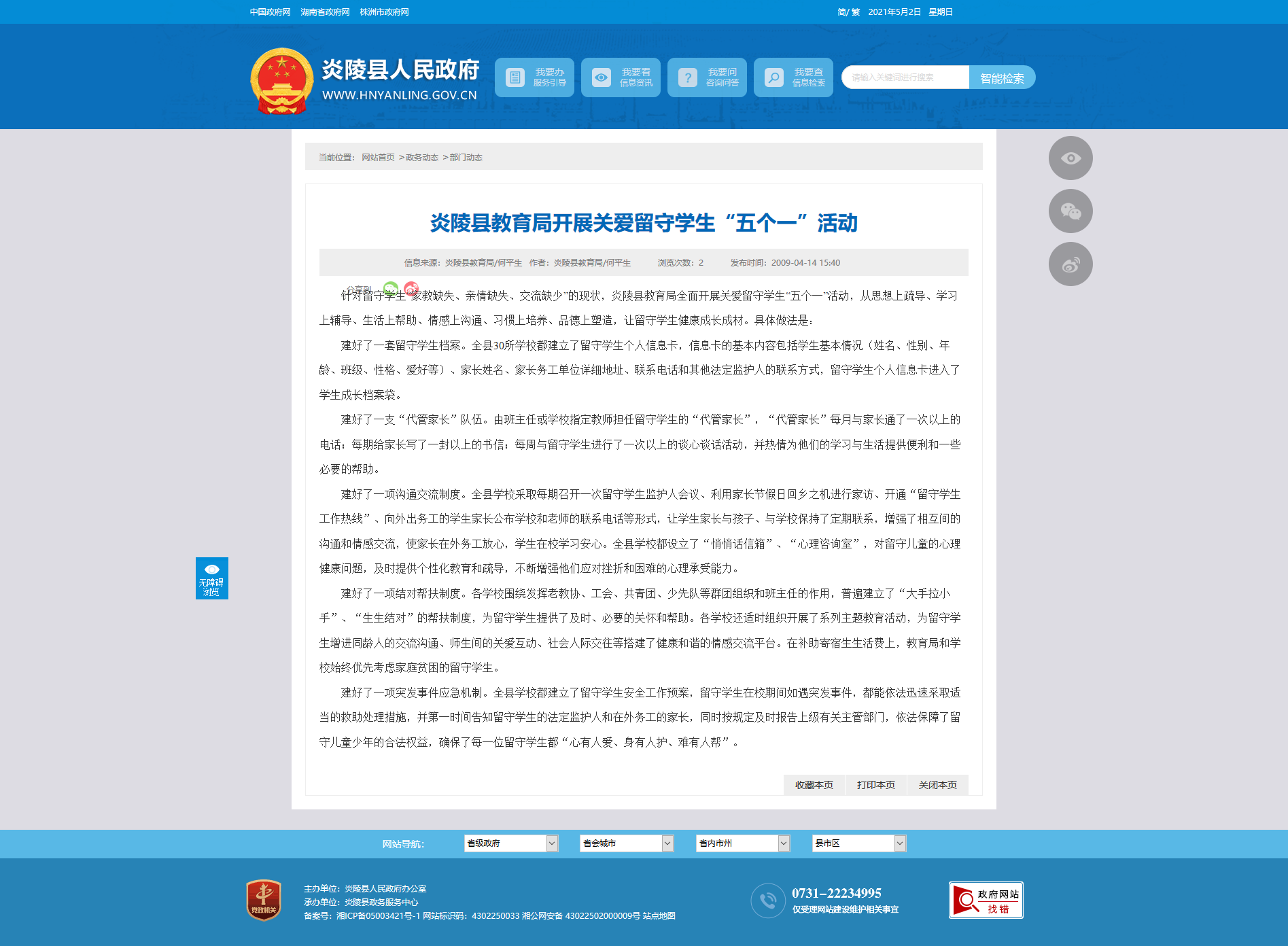 针对留守学生“家教缺失、亲情缺失、交流缺少”的现状,炎陵县教育局全面开展关爱留守学生“五个一”活动,从思想上疏导、学习上辅导、生活上帮助、情感上沟通、习惯上培养、品德上塑造,让留守学生健康成长成材。具体做法是:
