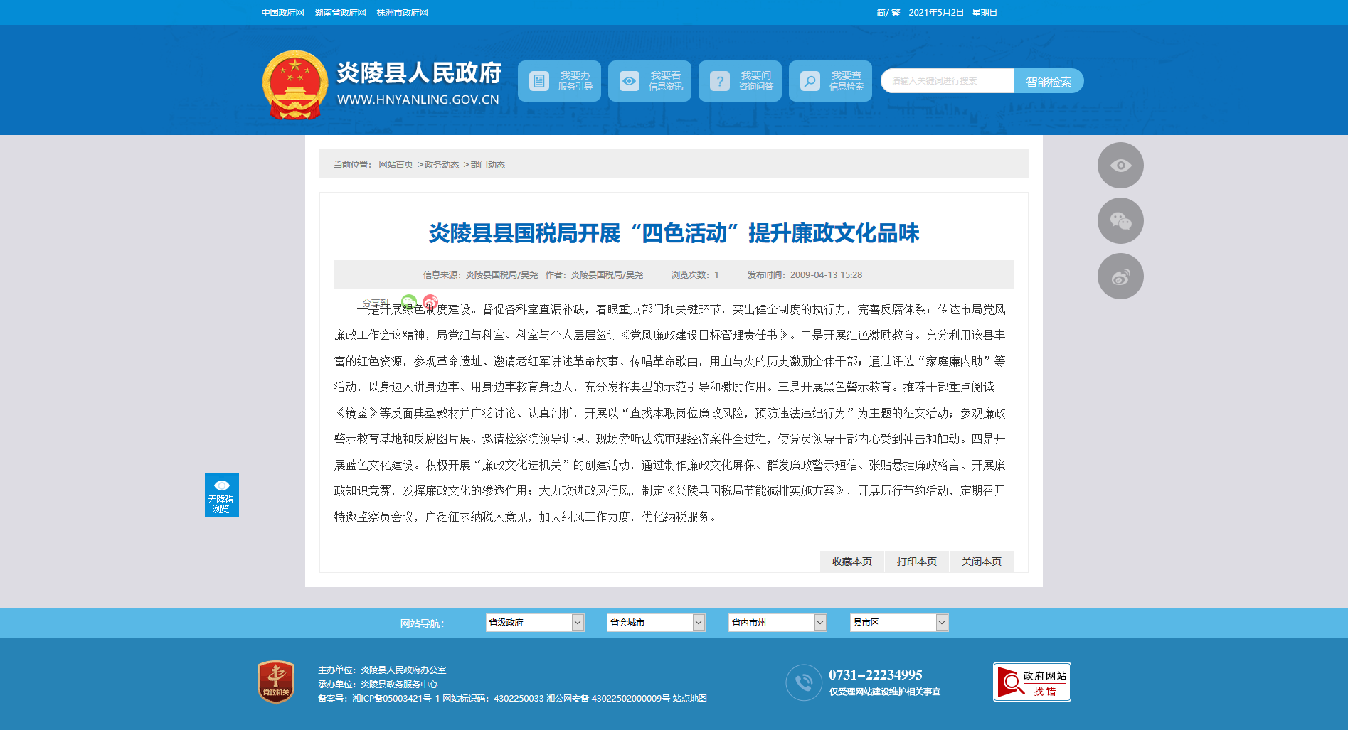 一是开展绿色制度建设。督促各科室查漏补缺,着眼重点部门和关键环节,突出健全制度的执行力,完善反腐体系;传达市局党风廉政工作会议精神,局党组与科室、科室与个人层层签订《党风廉政建设目标管理责任书》。二是开展红色激励教育。充分利用该县丰富的红色资源,参观革命遗址、邀请老红军讲述革命故事、传唱革命歌曲,用血与火的历史激励全体干部;通过评选“家庭廉内助”等活动,以身边人讲身边事、用身边事教育身边人,充分发挥典型的示范引导和激励作用。三是开展黑色警示教育。推荐干部重点阅读《镜鉴》等反面典型教材并广泛讨论、认真剖析,开展以“查找本职岗位廉政风险,预防违法违纪行为”为主题的征文活动;参观廉政警示教育基地和反腐图片展、邀请检察院领导讲课、现场旁听法院审理经济案件全过程,使党员领导干部内心受到冲击和触动。四是开展蓝色文化建设。积极开展“廉政文化进机关”的创建活动,通过制作廉政文化屏保、群发廉政警示短信、张贴悬挂廉政格言、开展廉政知识竞赛,发挥廉政文化的渗透作用;大力改进政风行风,制定《炎陵县国税局节能减排实施方案》,开展厉行节约活动,定期召开特邀监察员会议,广泛征求纳税人意见,加大纠风工作力度,优化纳税服务。