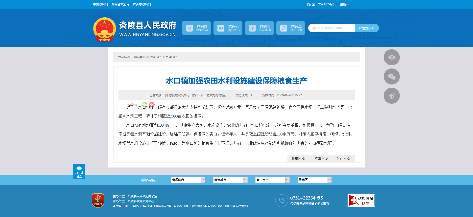 近日,水口镇在上级有关部门的大力支持和帮助下,投资近30万元,紧急修复了黄泥湾河堤、官仓下拦水坝、千工陂引水渠等一批重点水利工程,确保了镇区近2000亩农田的灌溉。