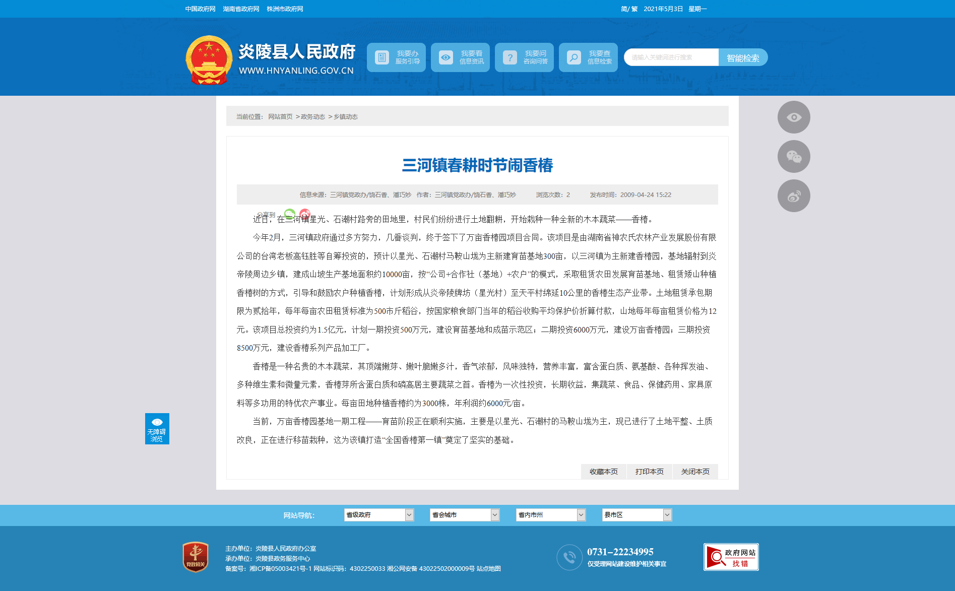 今年2月,三河镇政府通过多方努力,几番谈判,终于签下了万亩香椿园项目合同。该项目是由湖南省神农氏农林产业发展股份有限公司的台湾老板高钰胜等自筹投资的,预计以星光、石潮村马鞍山垅为主新建育苗基地300亩,以三河镇为主新建香椿园,基地辐射到炎帝陵周边乡镇,建成山坡生产基地面积约10000亩,按“公司 合作社(基地) 农户”的模式,采取租赁农田发展育苗基地、租赁矮山种植香椿树的方式,引导和鼓励农户种植香椿,计划形成从炎帝陵牌坊(星光村)至天平村绵延10公里的香椿生态产业带。土地租赁承包期限为贰拾年,每年每亩农田租赁标准为500市斤稻谷,按国家粮食部门当年的稻谷收购平均保护价折算付款,山地每年每亩租赁价格为12元。该项目总投资约为1.5亿元,计划一期投资500万元,建设育苗基地和成苗示范区;二期投资6000万元,建设万亩香椿园;三期投资8500万元,建设香椿系列产品加工厂。